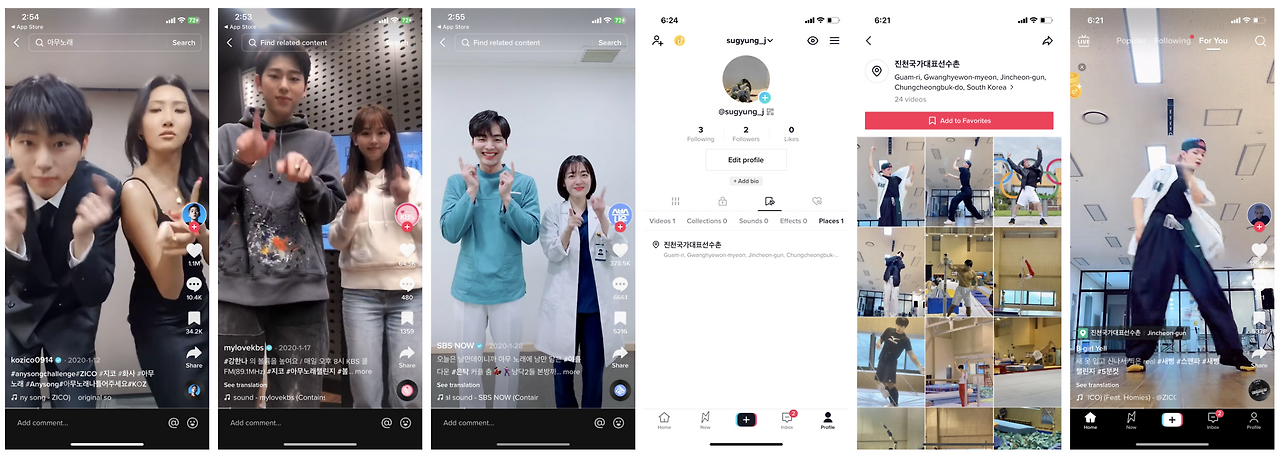 마지막 이미지의 좌측 상단에 자세히 보면 장소가 표시되어 있다. 같은 장소에서 찍은 콘텐츠들을 모아보거나, 즐겨찾기 할 수도 있다. 즐겨찾기를 하고 모아보는 기능은 장소뿐만 아니라 효과, 사용한 음악 등 다양한 곳에서 활용할 수 있다.