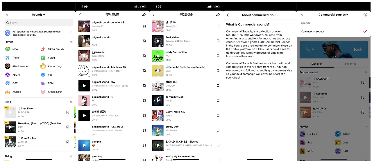 챌린지 외 상업적 용도로 사용되는 음악을 따로 모아놓은 Commercial sounds를 제공하고 있다. 틱톡커의 수입 중 큰 비중이 광고 수익이다. 제작에 있어 그들이 고민할 여러 가지 중 하나를 3) 쉽고 깔끔하게 해결해주고 있다.