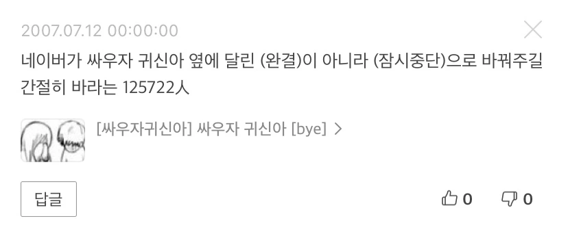 당시에 네이버 웹툰을 본 사람이다, 댓글을 달아본 사람이다 하면 '~~하는 n人'을 안 해본 사람은 없을 것이라고 확신한다. 정글고에 과몰입하며 만년삼정을 갈구하던 사람, 싸우자 귀신아에 진심이었던 사람이 바로 나다. 사람들은 댓글에 공감한다는 걸 표현하기 위해 숫자를 하나씩 늘려가며 댓글 릴레이를 이어나갔다. 1人, 2人, ..., 12203人. 그 당시의 좋아요라고 할 수 있다. '~~하는 n人' 형식의 댓글이 시작되면 그걸 이어나가는 게 풍습처럼 자리했던 것 같기도 하다. 그리고 내 기억이 맞다면 중간에 꼭 누군가 숫자를 말도 안 되게 뻥튀기를 하곤 했다.