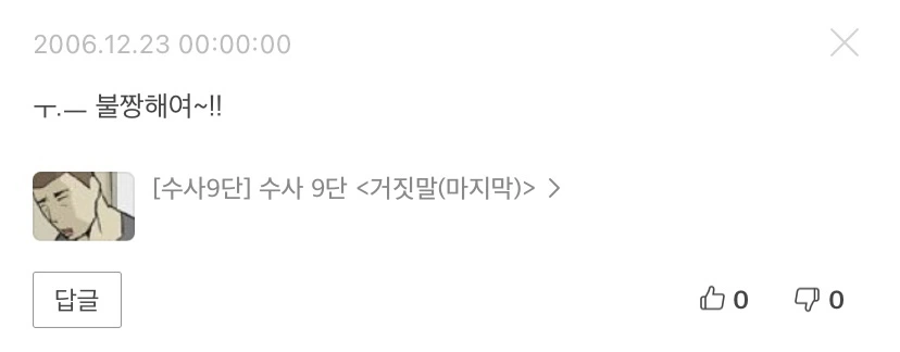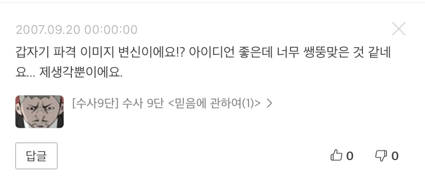 네이버 웹툰의 My 탭에 가면 내가 작성한 댓글들을 볼 수 있다. 처음 오픈되었을 때, 옛날에 쓴 댓글을 찾아보는 재미가 소소하게 화제가 되었던 것으로 기억한다. 나의 네이버 웹툰 첫 댓글은 'ㅜ.ㅡ 불짱해여~!!' 다. 약 9개월 뒤 수사9단을 너무 좋아하던 초등학생은 작가에게 의견을 피력하기도 했다. 너무 생뚱맞은 것 같다고. '아이디어는 좋다, 제 생각일 뿐이다'라며 나름 쿠션어를 사용했다.