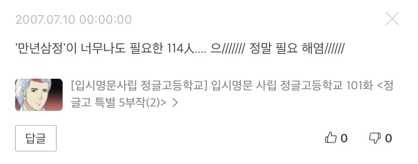 + 내가 처음 네이버 웹툰을 볼 때엔 요일별로 작품이 3개 4개가 전부였던 시절이다. 요즈음은 요일마다 30개는 거뜬히 되는 것 같다. 만화가 보고 싶어서 네이버에 '만화'라고 검색하고 접속한 게 시작이었고, 그때는 웹툰이라는 단어도 없었다. 자주 보던 건 수사 9단, 정글고, 마음의 소리, 낢이 사는 이야기, 나이스 진타임 정도가 생각난다. 댓글도 게시판의 댓글같이 아주 기본의 기본처럼 생겼었다. 좋아요나 답글은 없었고 신고하기는 있었던 것 같다.