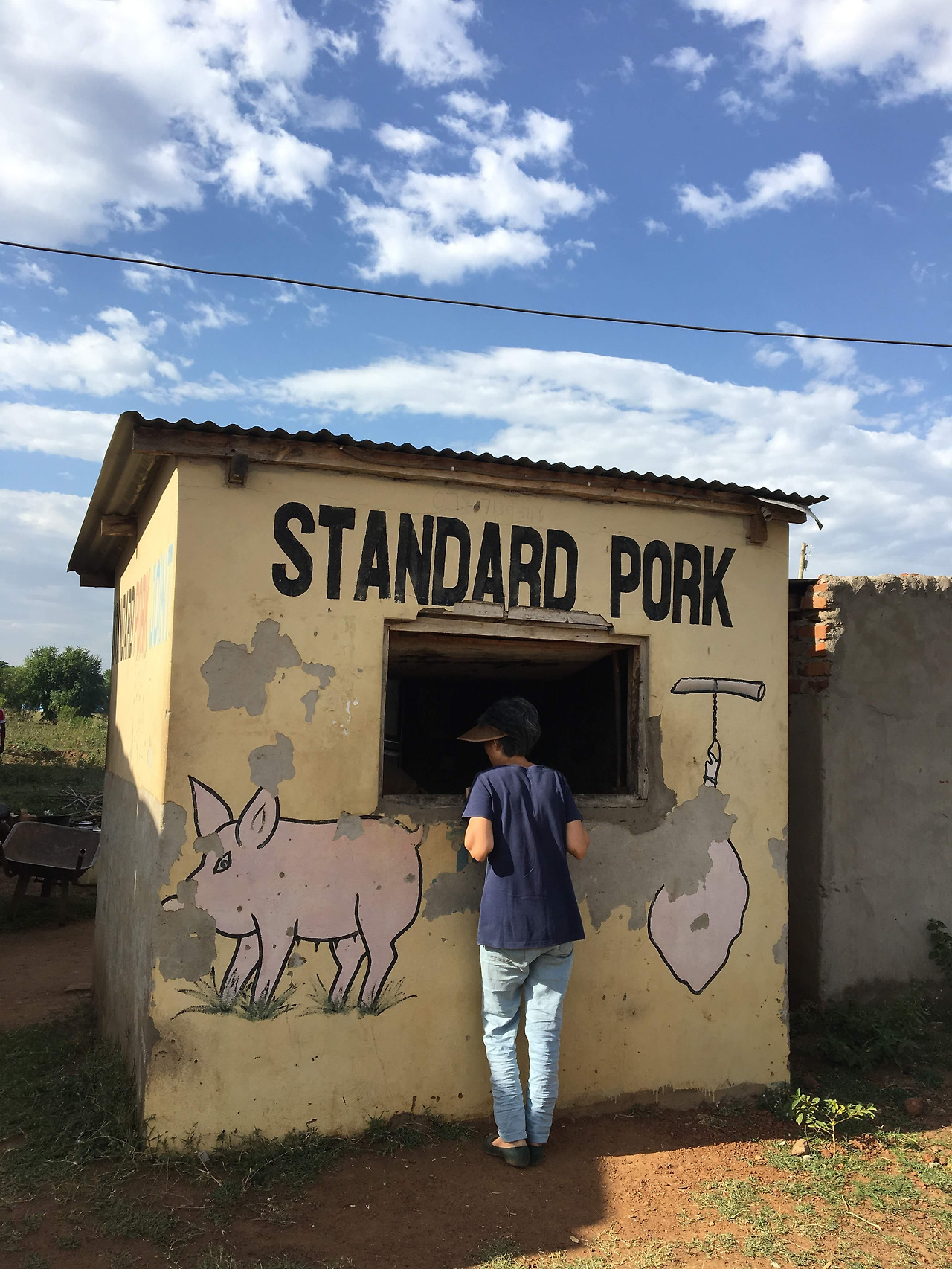 그다음에는 대학교 근처에 돼지고기를 사러 갔어. 동네 정육점 같은 곳인데 가게 바깥쪽에 그려져 있는 돼지가 밝은 상아색 벽 색깔과 어우러져서 상당히 귀여워. 귀여운 겉모습과는 다르게 안에서는 상체가 없는 돼지 하체를 그냥 두동강내는 장면을 보기는 했지만 말이야.