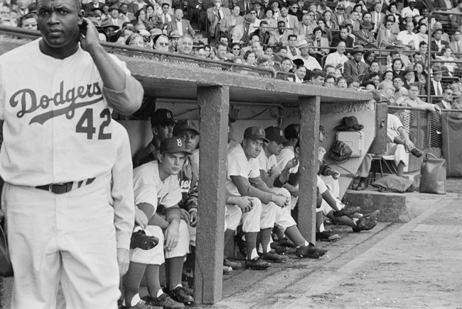 사상 최초의 흑인 메이저리거가 된 재키 로빈슨. 하지만 그는 온갖 협박과 조롱을 견뎌야만 했다. (더그아웃 밖에 서있는 사람이 재키 로빈슨)