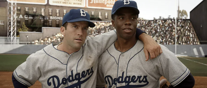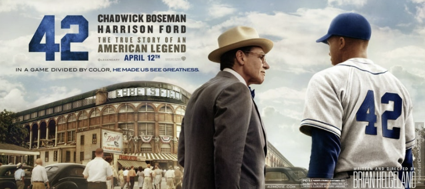 재키 로빈슨의 일대기를 그린 영화 <42>의 포스터. 브렌치 리키 役의 해리슨 포드와 재키 로빈슨 役의 채드윅 보스만