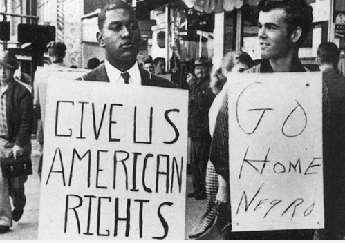 '우리에게도 미국 국민으로서의 권리를 달라'고 주장하는 흑인 옆에서 '니그로는 집으로 가라'는 팻말을 들고 있는 백인. 인종차별로 얼룩진 당시 미국의 부끄러운 자화상이다.