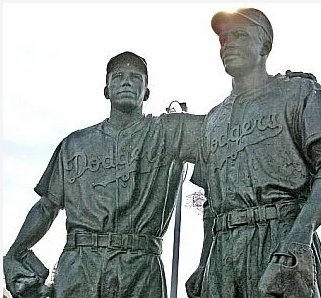 야유가 쏟아지고 있던 경기 중 재키 로빈슨에게 다가와 어깨동무를 하는 피 위 리즈. 이 장면은 인종차별에 반대하는 상징적인 장면이 되었다.