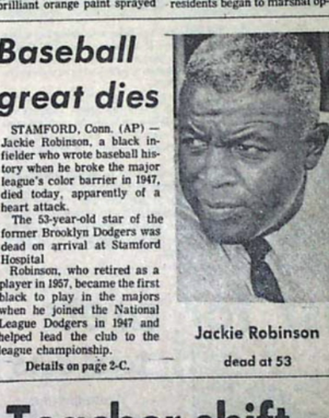 위대한 야구선수 재키 로빈슨의 사망소식을 다룬 신문기사