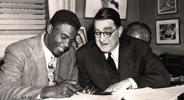 마침내 메이저리그 <브루클린 다저스>와 계약하고 있는 재키 로빈슨(좌)과 브렌치 리키(우) 다저스 단장