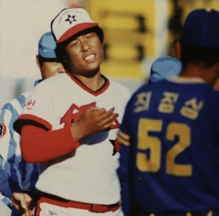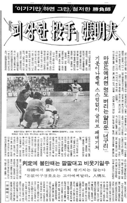 '빈볼'의 대명사 장명부. 몸에 맞는 공을 던진 후 화가 난 타자를 바라보며 특유의 미소를 짓고 있다.