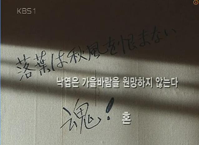 장명부 사후 제작된 KBS 스페셜에서 마작하우스 벽에 쓰여 있었던 것으로 전해지는 '낙엽은 가을바람을 원망하지 않는다'는 글귀를 재현한 장면.