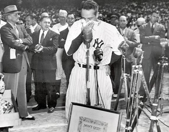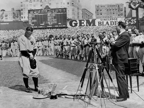 1939년 7월 4일 '루 게릭 감사일'. 루 게릭을 보기 위해 양키 스타디움을 가득 메운 사람들 앞에서 루 게릭이 고개를 떨구고 있다.