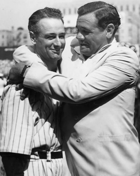 마지막 연설을 마친 루 게릭을 꼭 안아주는 베이브 루스. 메이저리그를 상징하는 두 슈퍼스타가 양키 스타디움에서 만난 마지막 모습이었다.