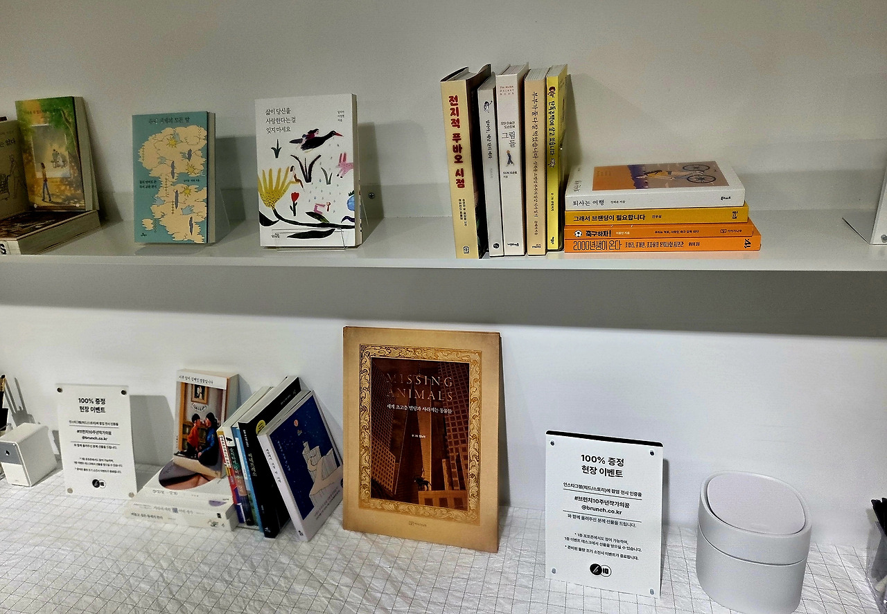 브런치 10주년 축하 코너와 브런치의 시작부터 지금까지 지나온 길을 정리해 놓은 곳을 지나 브런치 10주년 팝업 전시의 메인인 2층 '작가의 꿈' 존으로 이동하였습니다. 2층에 올라가자마자 역대 브런치북 수상작들이 전시되어 있었는데요, 올해엔 저 자리에 저도 있었으면 하는 욕망이 뜨겁게 올라왔습니다 ㅎㅎ 전시된 책 사진을 찍는데 고수리 작가님을 그만... 고수리 작가님 죄송합니다. ㅎㅎ
