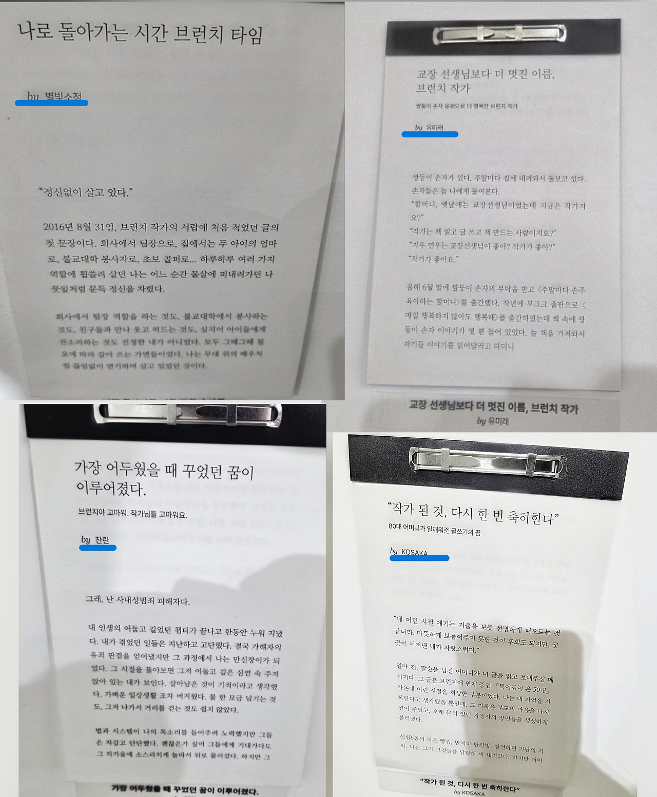 그리고 팝업 전시의 하이라이트, '브런치 10주년 작가의 꿈' 전시가 이어집니다. 이번 팝업 전시를 위해 쓴 수많은 글 중에 100편을 선정, 전시되어 있습니다.