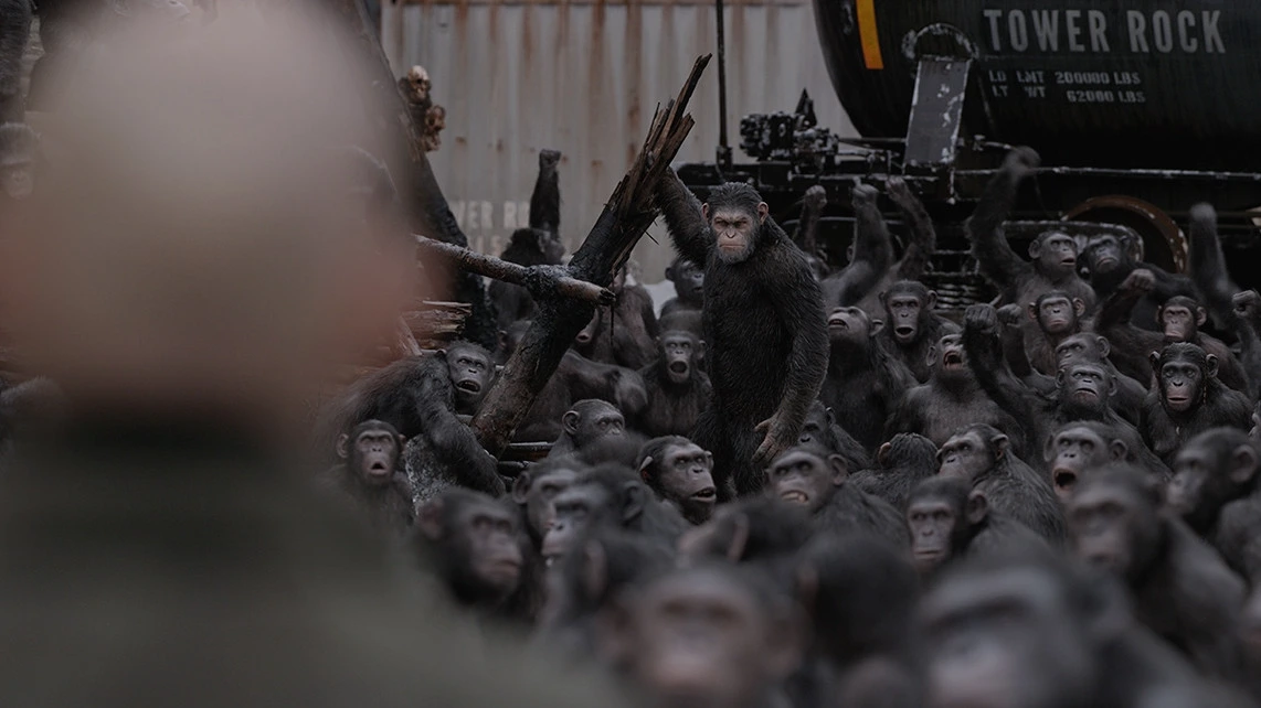 극 중 명확하게 표현되진 않았지만 영화 외적으로 공개된 자료에 따르면 시저 사후 300년 뒤를 다루고 있다고 한다. 오리지널 <혹성탈출>과 같이 이미 인류의 퇴화와 유인원의 진화가 충분히 이루어진 시대다. <혹성탈출: 진화의 시작>이 오리지널 <혹성탈출>의 프리퀄(은 아니지만 굳이 따지자면)이라면, 본편은 <혹성탈출>의 리메이크에 가깝다. 흡사한 배경을 기반으로 영화 팬들이라면 하나하나 찾아보는 즐거움을 느낄 수밖에 없는 요소들을 쏙쏙 집어넣었다. 특히 인간 사냥 장면은 노골적으로 <혹성탈출>이 떠오르게 하는데, 물론 사냥 목적을 비롯하여 여러 디테일한 요소들에 차이는 있지만 이 영화가 추구하는 방향을 짐작할 수 있게 한다.