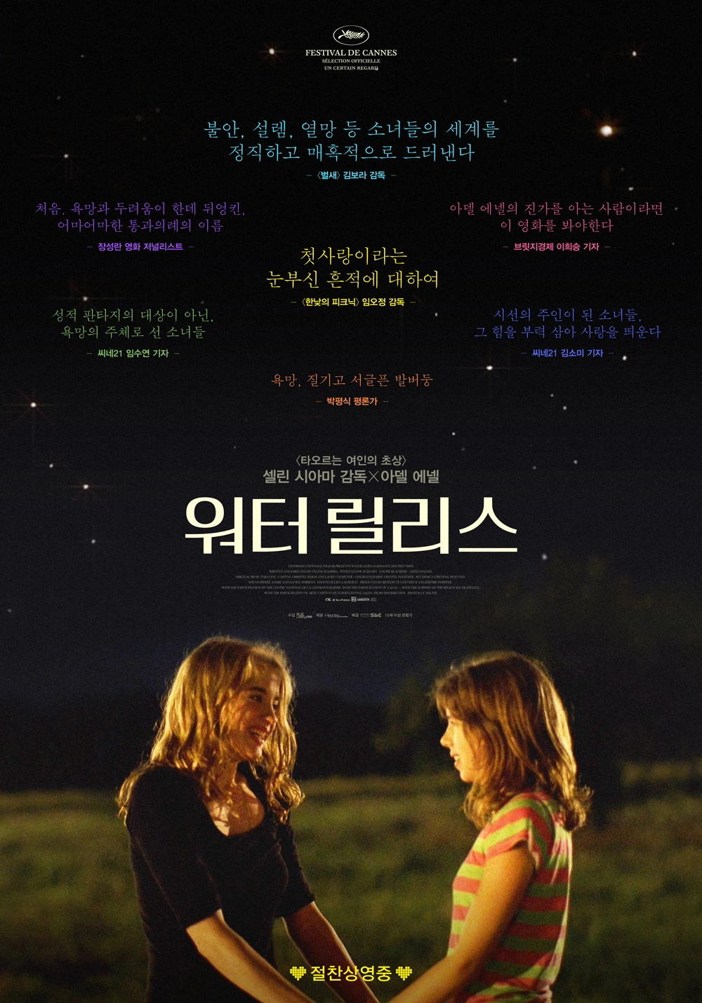 싱크로나이즈 댄서들의 물 밑 모습이 문어처럼 보여서 지은 이름일 것이며, 그 모습이 제목인 건 시각적으로 제일 강력한 이미지이면서 이야기가 전개되는 배경이고, 주제인 사춘기의 표면적 잔잔함 속 내면적 혼란이란 상징성을 표현하기 때문일텐데 왜 그것을 워터릴리스, 즉 수련으로 번역했을까? 찾아보니 뿌리가 못나지도 않고, 꽃말도 애매해 유일한 연관성은 물에 있다는 것뿐인 것 같은데 말이다.