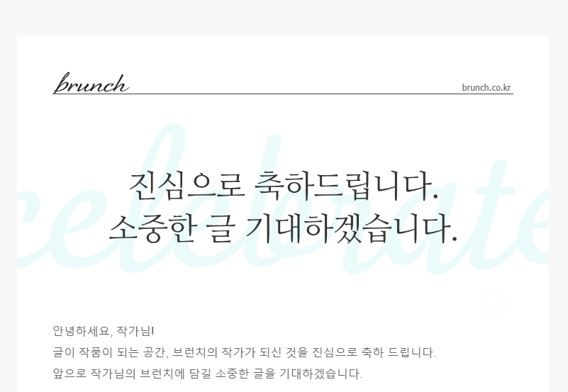 그래서 일단 글 하나를 써서 작가 신청을 했고, 기대되는 마음을 애써 누르며 있는데 브런치 작가가 되었다는 메일이 왔다. 작가라는 호칭이 낯뜨겁지만 그것은 기분 좋은 압력을 준다. 진정한 작가가 되기 위해 일단 글을 써보자는 마음이 들게 한다.