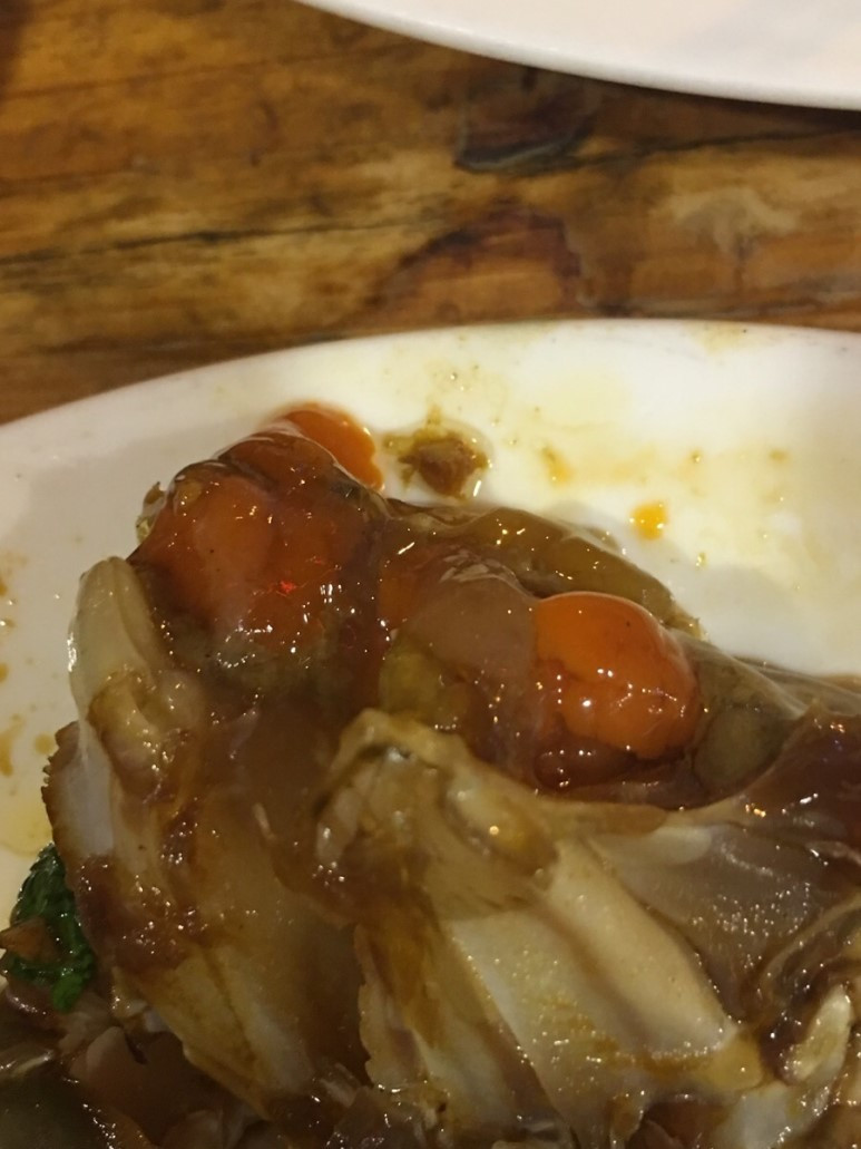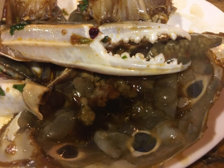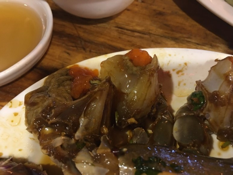 다음으로 나온 요리는 게장!!! 어쩜 한국에서 먹는 간장게장과 맛이 거의 비슷하다! 고추가 들어갔는지 살짝 매콤한 것이 역시 밥도둑이다. 날 것을 먹지 않는 남편은 접시를 내쪽으로 밀어주며 실컷 먹으란다. 예전에 기생충 얘기를 하며 될 수 있으면 먹지 말라더니 오늘은 웬일로 시켜주냐 물었더니 이 식당에서 제일 유명한 요리로만 시켰다며 내일 바로 구충제 사준다고 ㅎㅎ