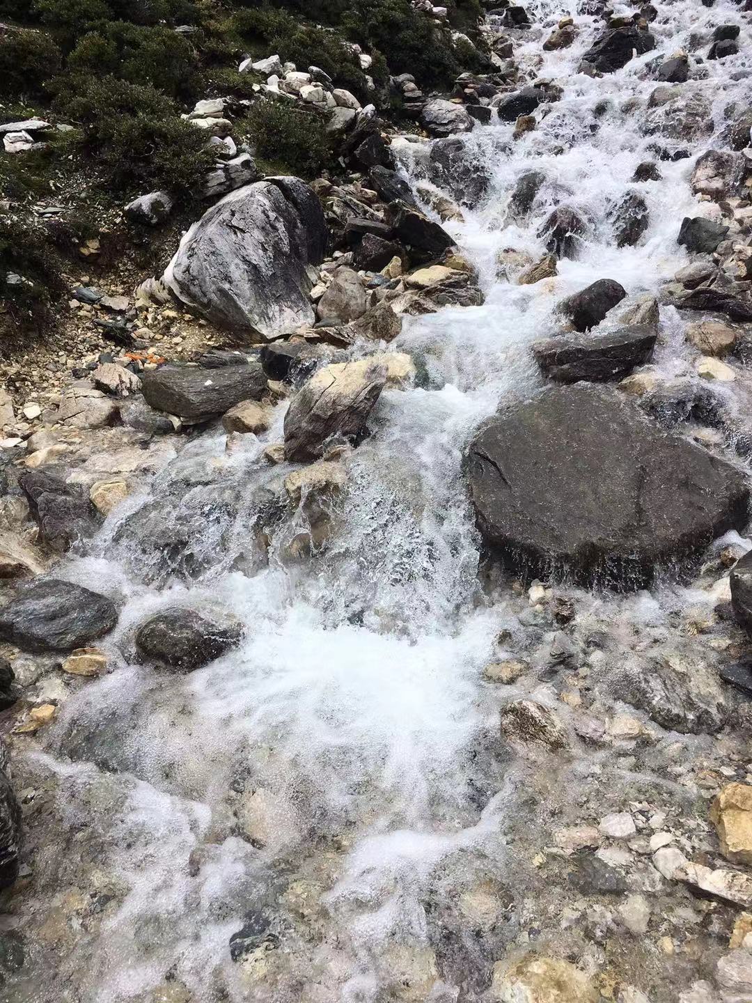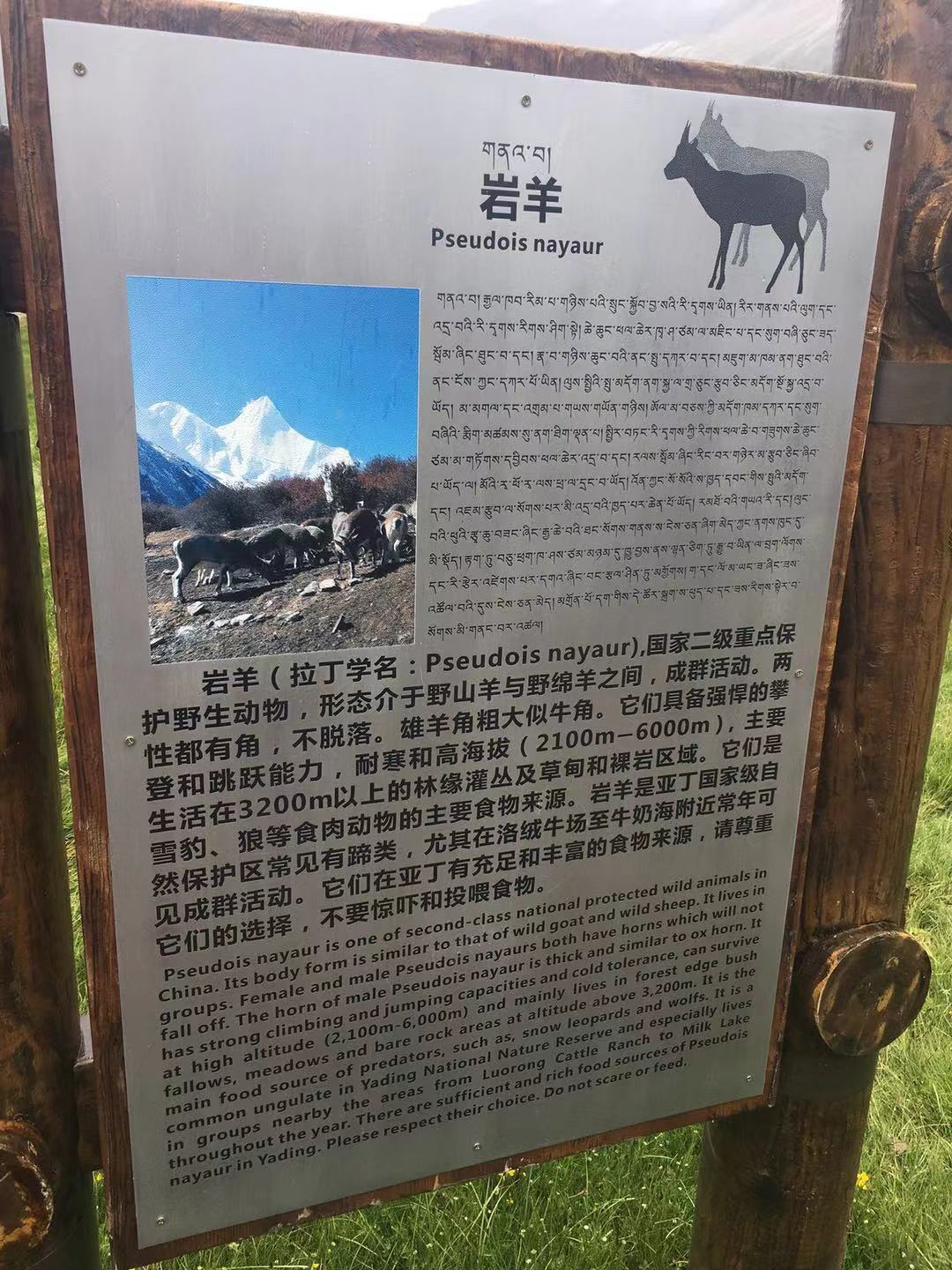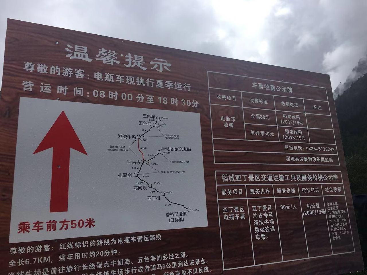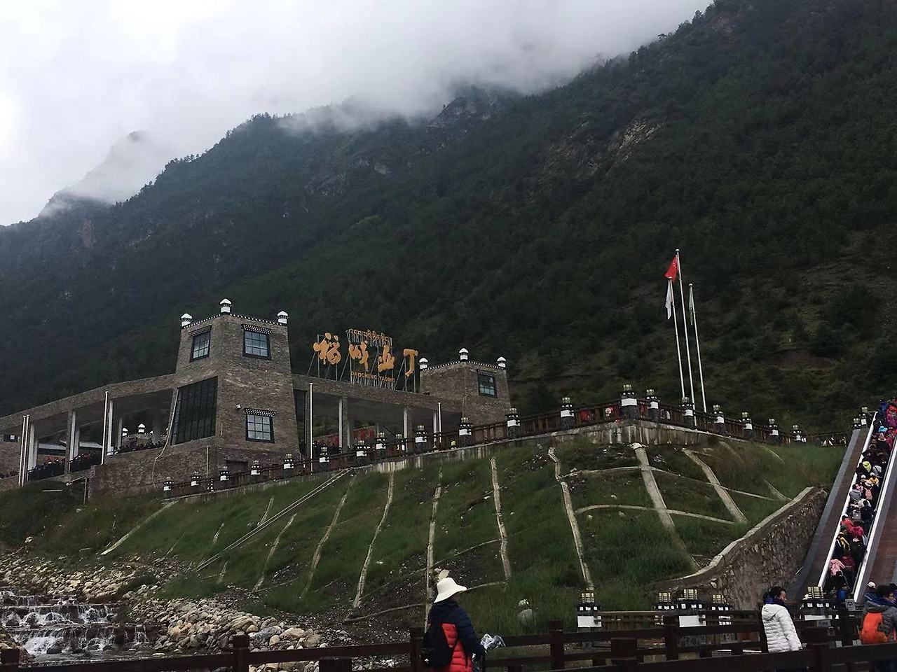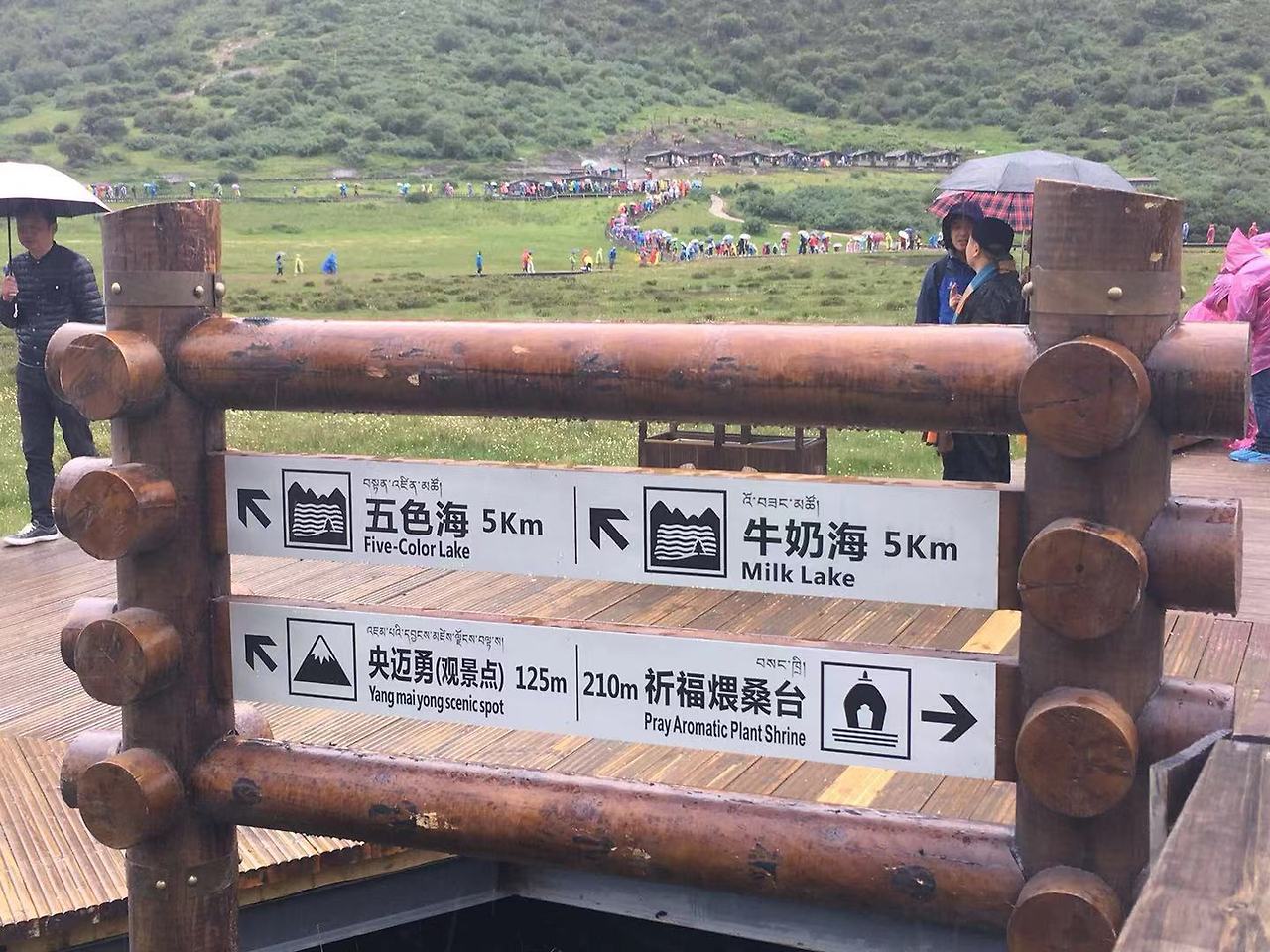 버스에서 내린 후, 10분 정도를 걷다 다시 미니버스를 타고 20분 정도를 올라간다. 종점 앞에 호텔에서 찍어왔던 안내판과 비슷한 표지판이 보인다. 트래킹의 최종 목적지는 해발 4,700m에 위치한 우써하이(五色海 오색해 : 다섯 가지 색깔의 호수), 만약에 거기까지 못 간다면 두번째 목표는 그보다 낮은 뉴나이하이(牛奶海 우유해 : 우유 색깔의 호수 *왼쪽 사진에 있는 실제 안내판에 五色海로 잘못 적혀 있었다)