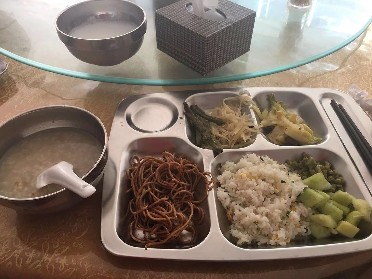 이번 숙소는 비지니스호텔로 레스토랑에서 인민폐15원을 내면 아침을 먹을 수 있다. 맛있으면 맛있어서 잘 먹고, 맛없으면 배라도 채우려고 잘 먹는 우리 부부는 각각 이만큼이나 떠서 먹고 있는데, 열 살짜리 까탈도령은 입맛이 없다, 먹을 게 없다 궁시렁대며 개미 코딱지만큼 먹더니 그만 먹겠단다. 여기보다 한참 높은 곳으로 가야 하는데, 그것도 트래킹을 해야 하는데, 벌써부터 시작이 불길하다.
