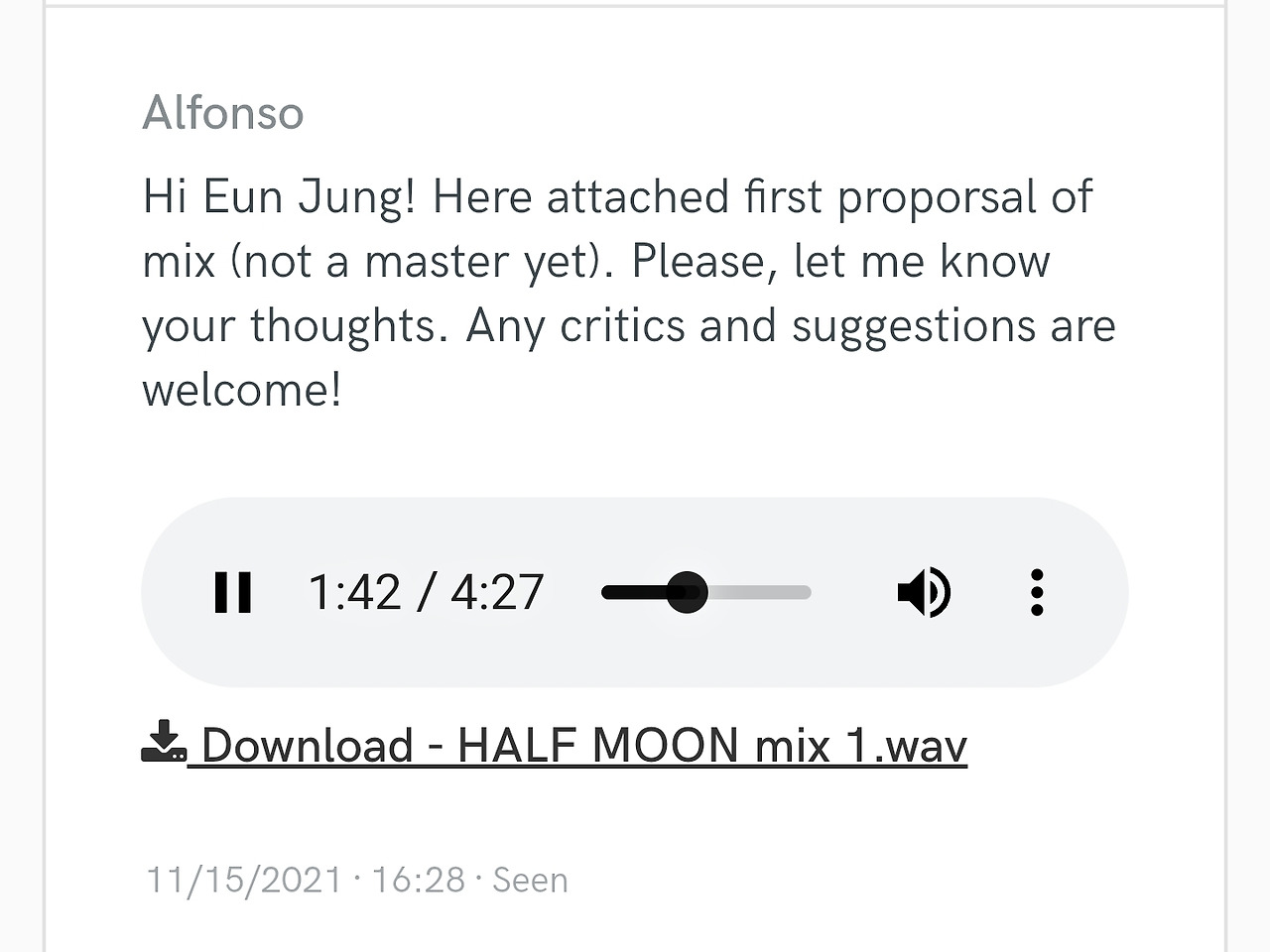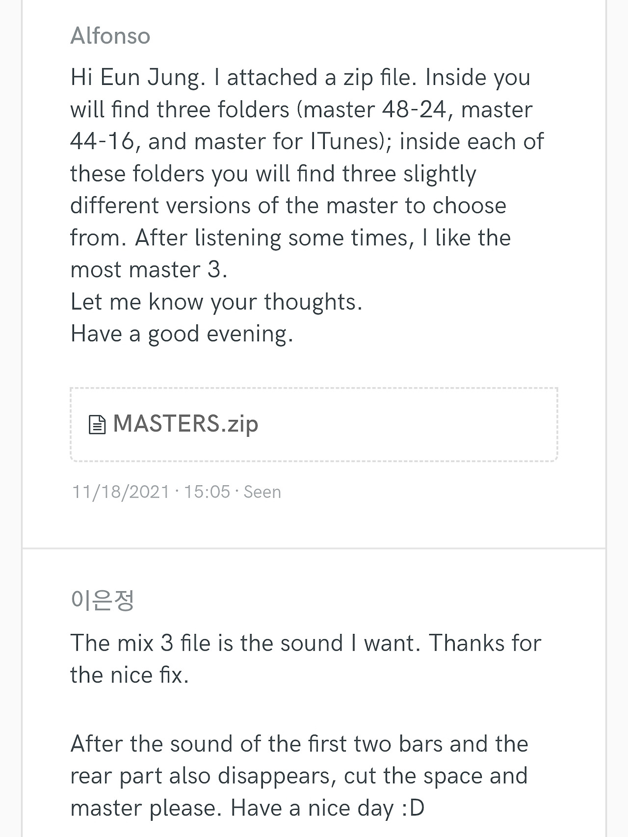첫 믹싱 된 버전을 받고 두 가지를 제시했다. 37마디의 박자 튠과 공간감을 더 주었으면 좋겠다고. 그랬더니 그 다음날 두 개의 트랙이 있었다. 그중 나는 3번이 마음에 들었고 확정했다. 아직 현재의 파일은 확인 안 했지만 한국과 달리 마스터하고, 여러 버전으로 줬다. 이런 디테일 좋다.