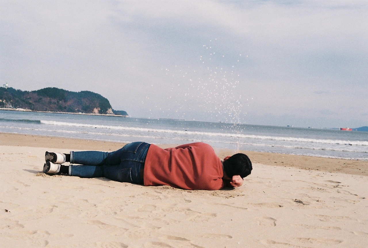 영일대 해변에서 영화 "밤의 해변에서 혼자" 김민희 포즈를 따라해 봤다. 머리 쪽에 자세히 보면, 다이소에서 구입한 폭죽을 터트렸는데, 낮이라 잘 안 보인다.