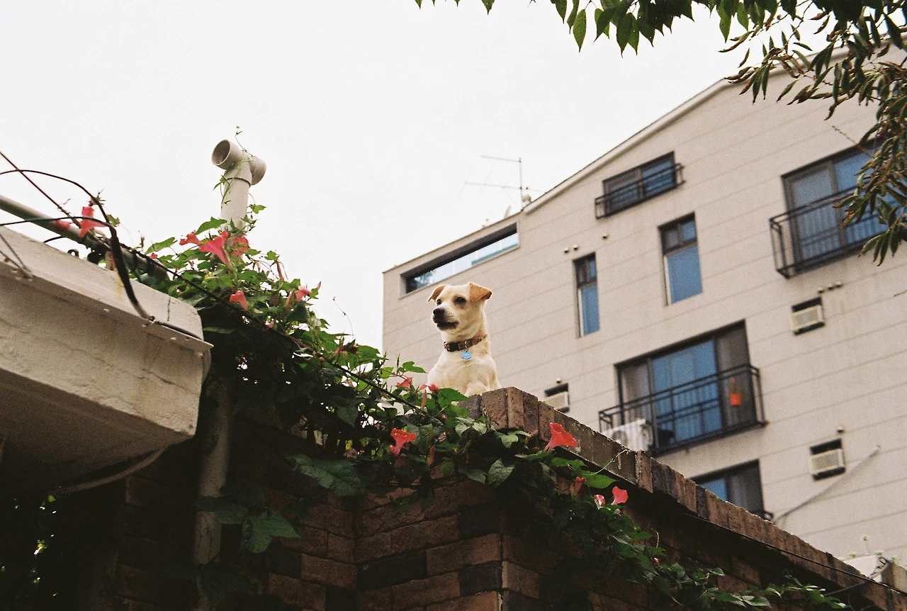 걷는데 누가 위에서 날 지켜보고 있는 거 같아.. 위를 쳐다봤더니 꽃에 둘러싸인 강아지가 있네. (나팔꽃인가?)