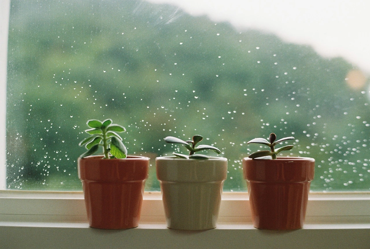 미니화분은 엄마 감성. 비 온 뒤 창문에 맺힌 빗방울 배경으로 사진을 찍는 건 내 감성.