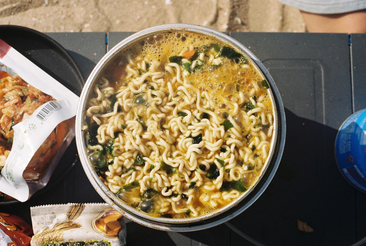캠핑 다음날 아침은 너구리 라면. 마지막은 햇반 말아서, 하아....엄지 척!
