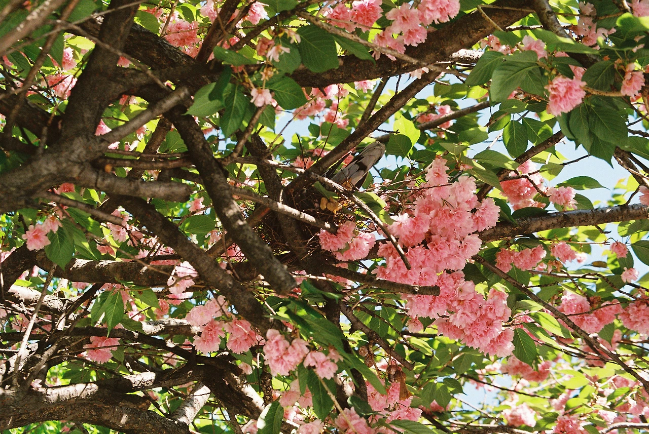 겹벚꽃 나무안에서 어미새가 알을 품고 있다