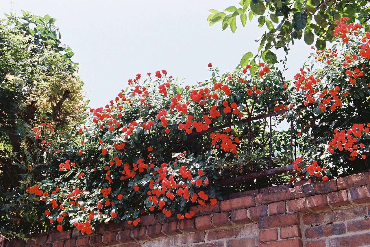 주택 담벼락의 미니장미