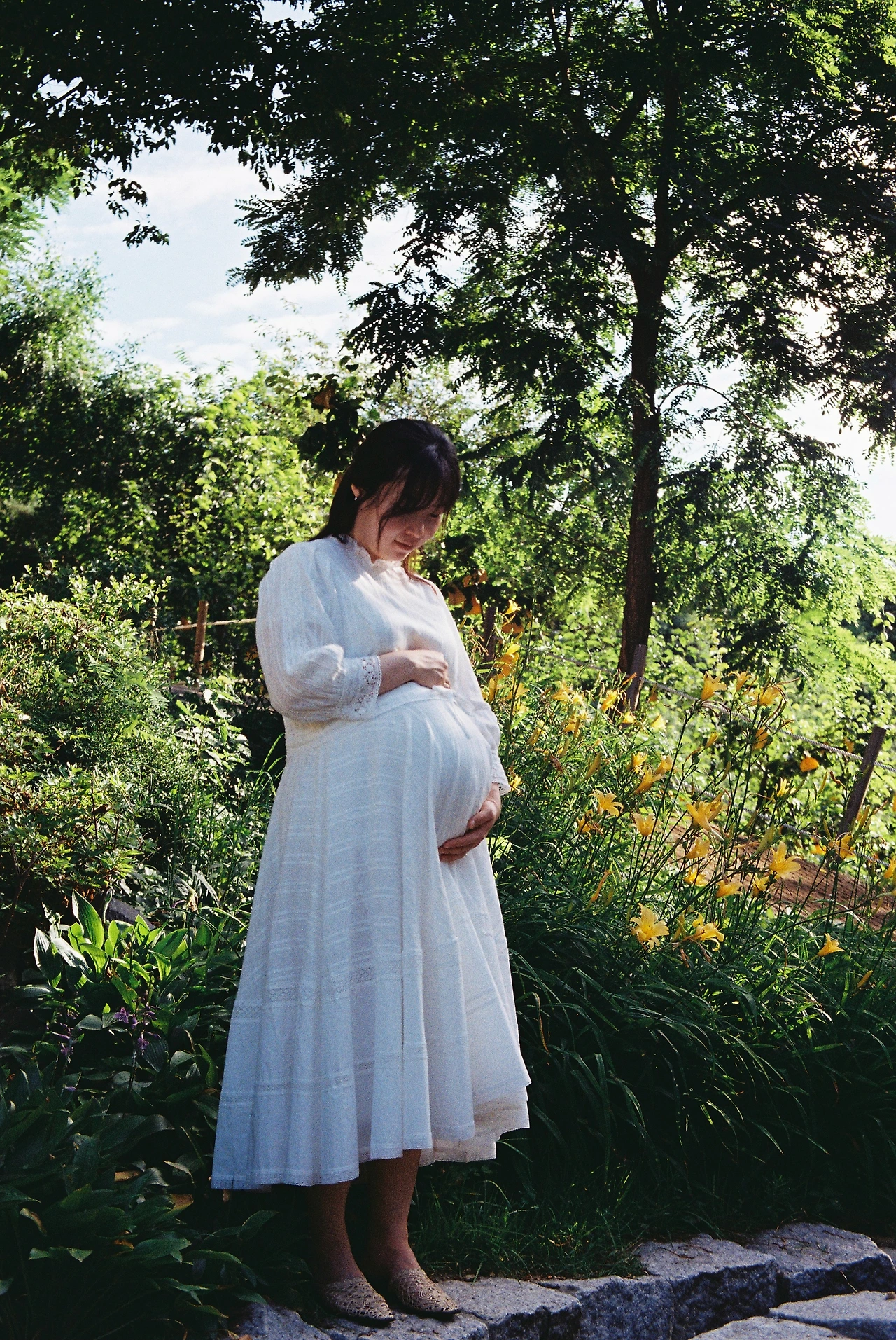 코로나19 때문에 만삭 사진을 찍지 않은 누나. 카메라 들고, 동네에서 내가 찍었다. 필름 사진은 있는 그대로를 보여준다. 포토샵 보정을 못 해. 지켜주지 못해서 미안해.