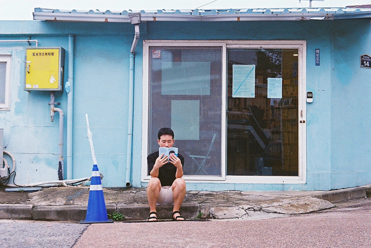 책방모도 앞에서 책 읽는 컨셉 사진 찍었다. 다리를 일자로 쭉 필걸. 다리가 너무 두껍게 나왔네.