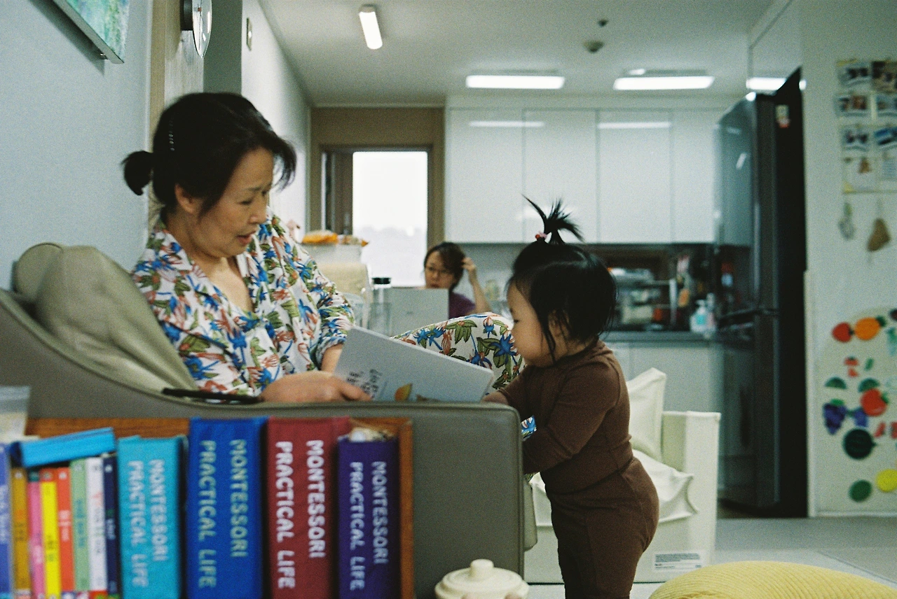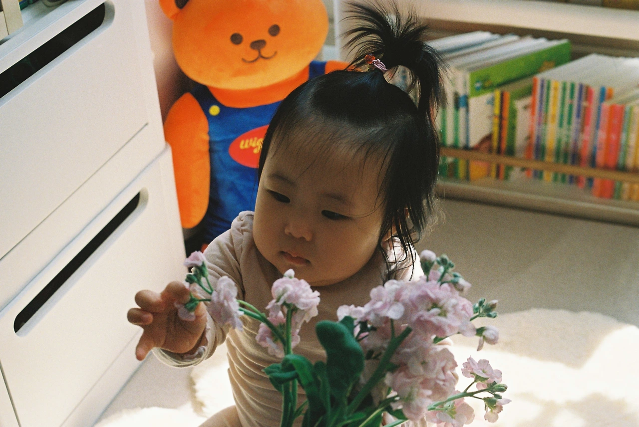 향이 강한 스토크 꽃을 샀다. 향을 맡아도 보고, 만져도 보는 린이.