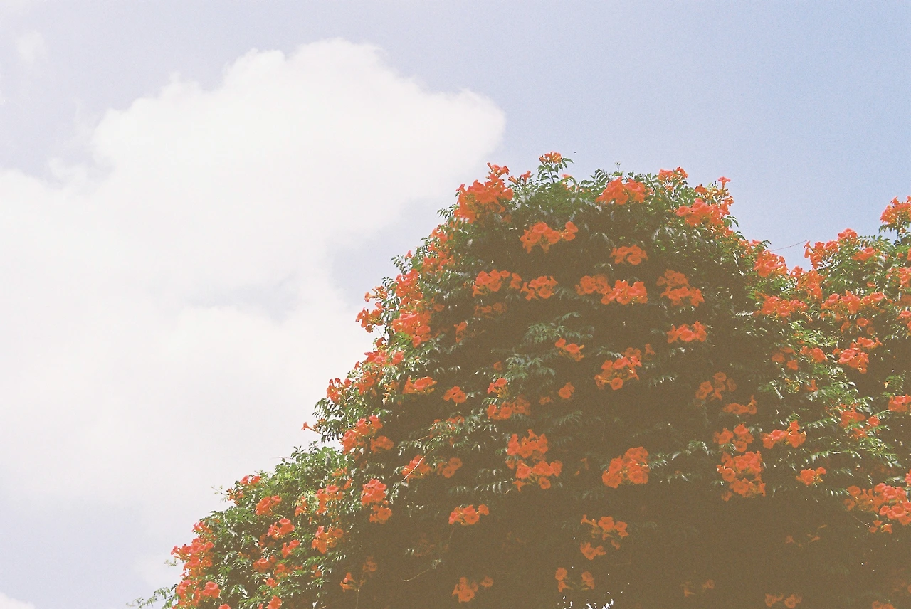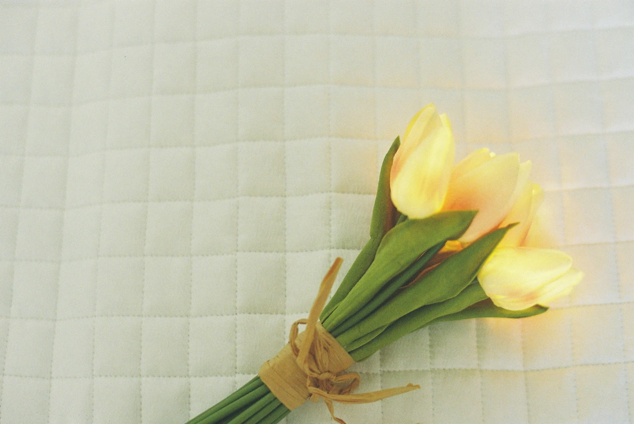 무늬 없는 하얀 침대보에 진짜 꽃을 놨어야 가능했을까?