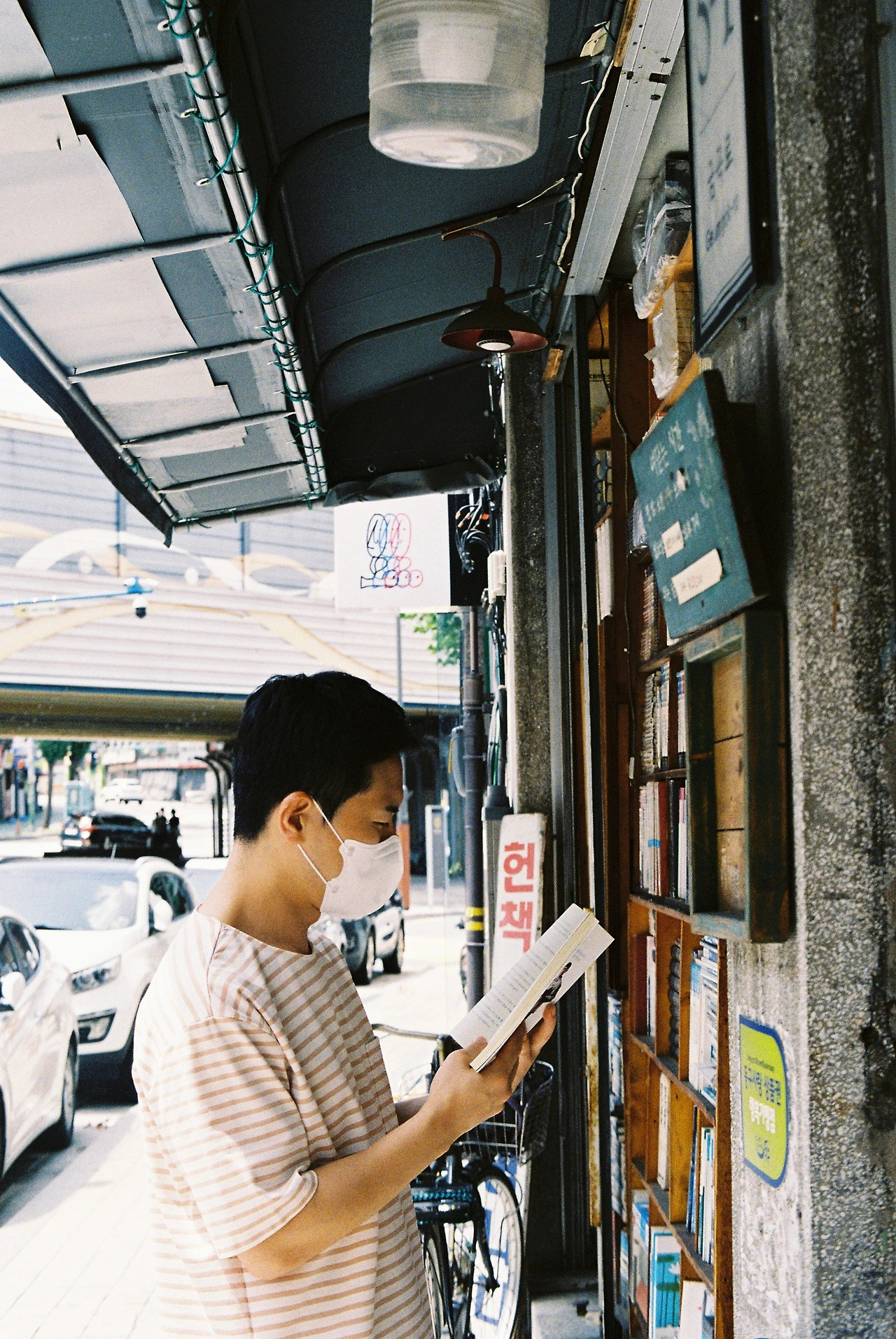 한미서점 앞에서 책 읽는 컨셉. 턱 선이 없네? 없는 이유가 다 있다. 인생 몸무게 찍었다. 77kg. 살 빼쟈! -7kg
