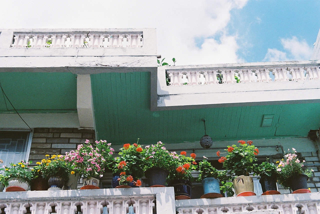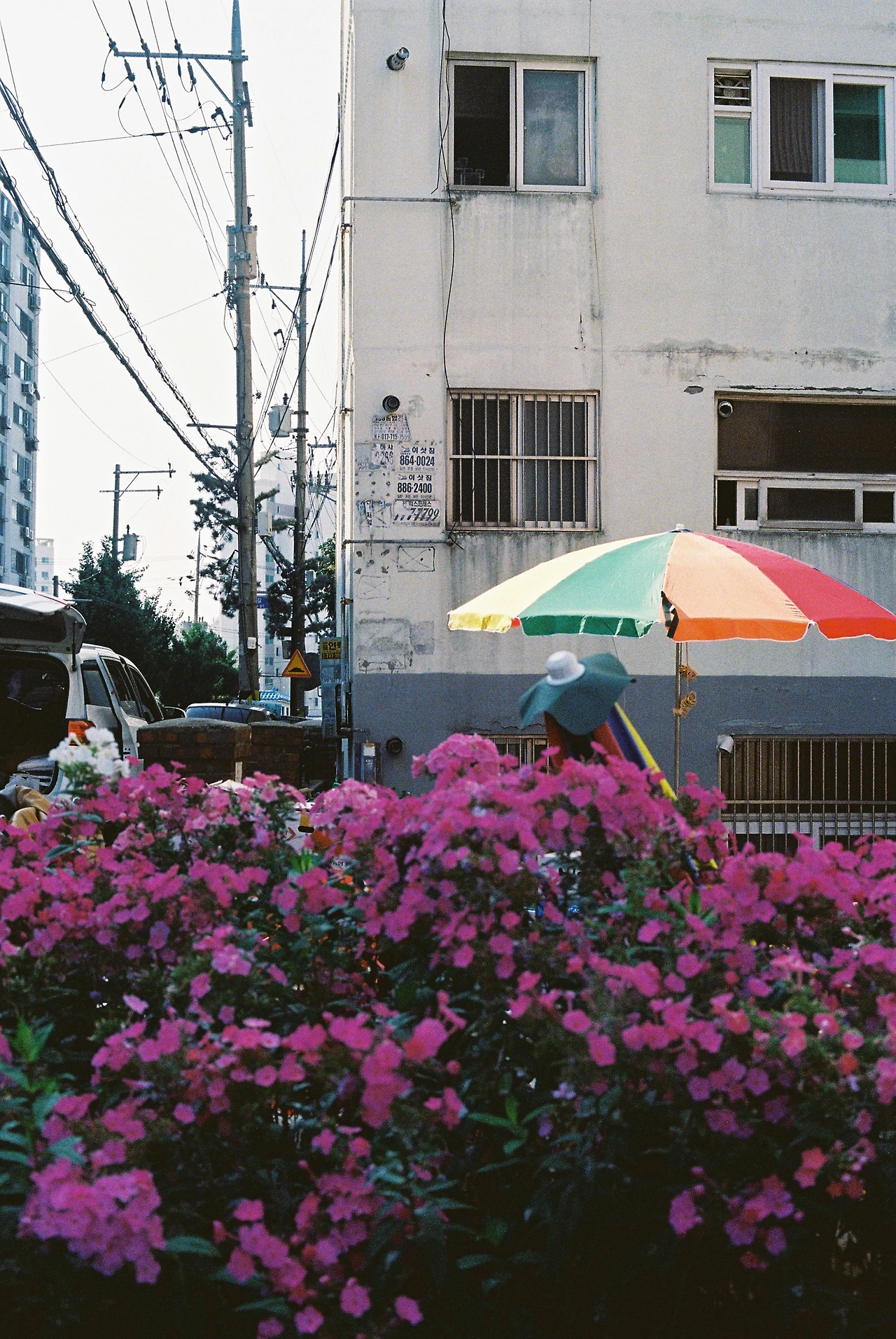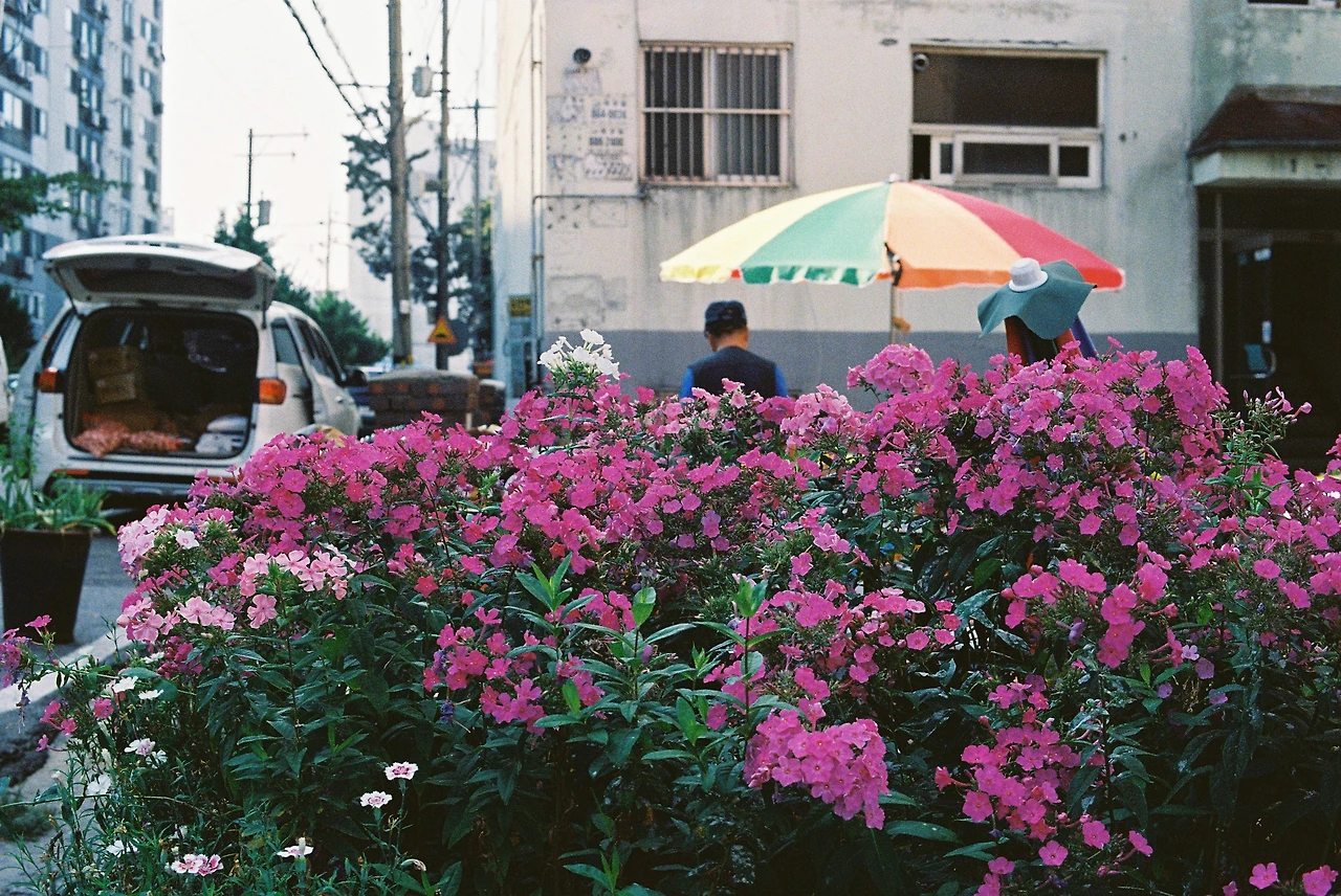 길거리에 핀 꽃과 무지개 파라솔이 잘 어울려