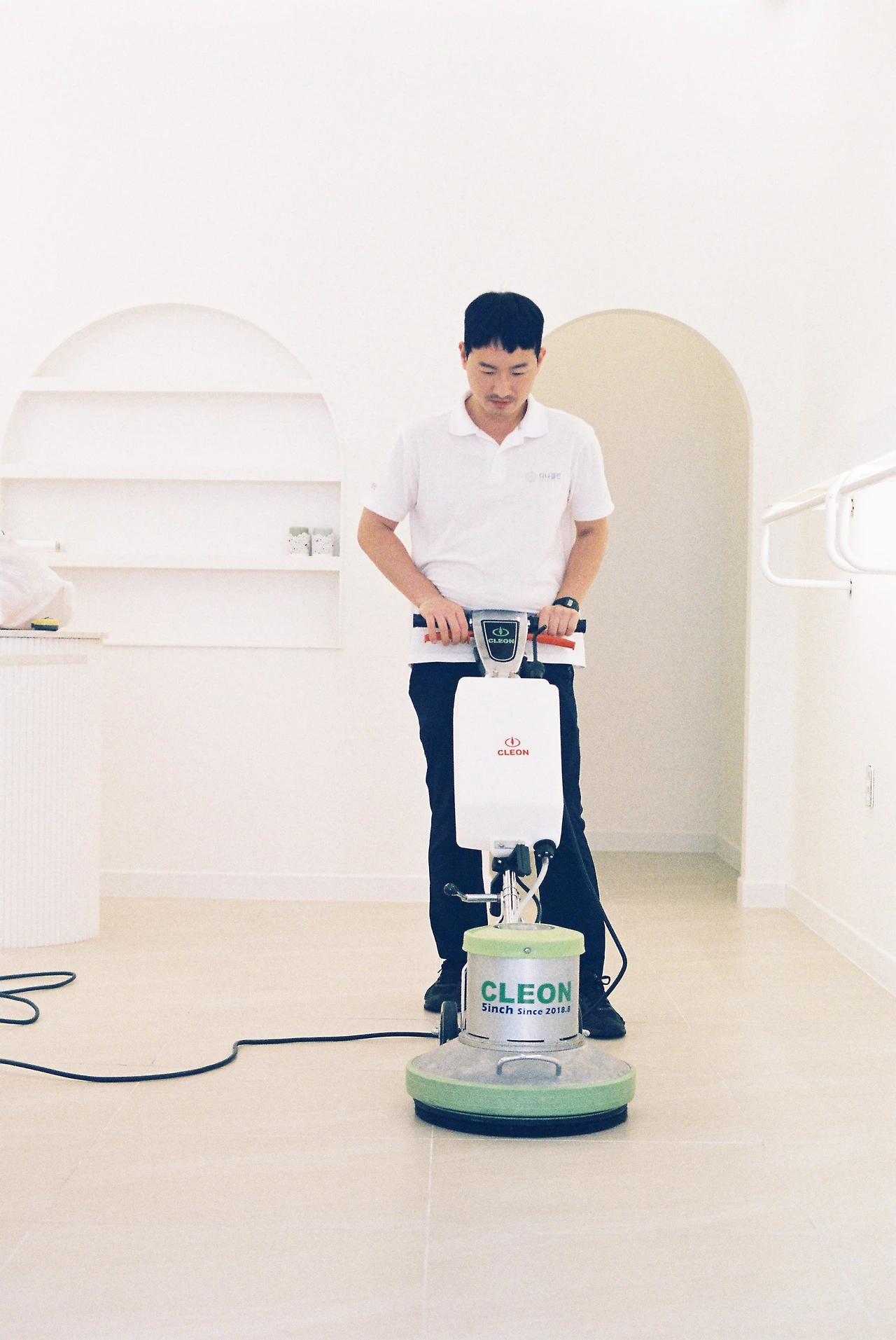 마루광택기로 바닥 닦는 중