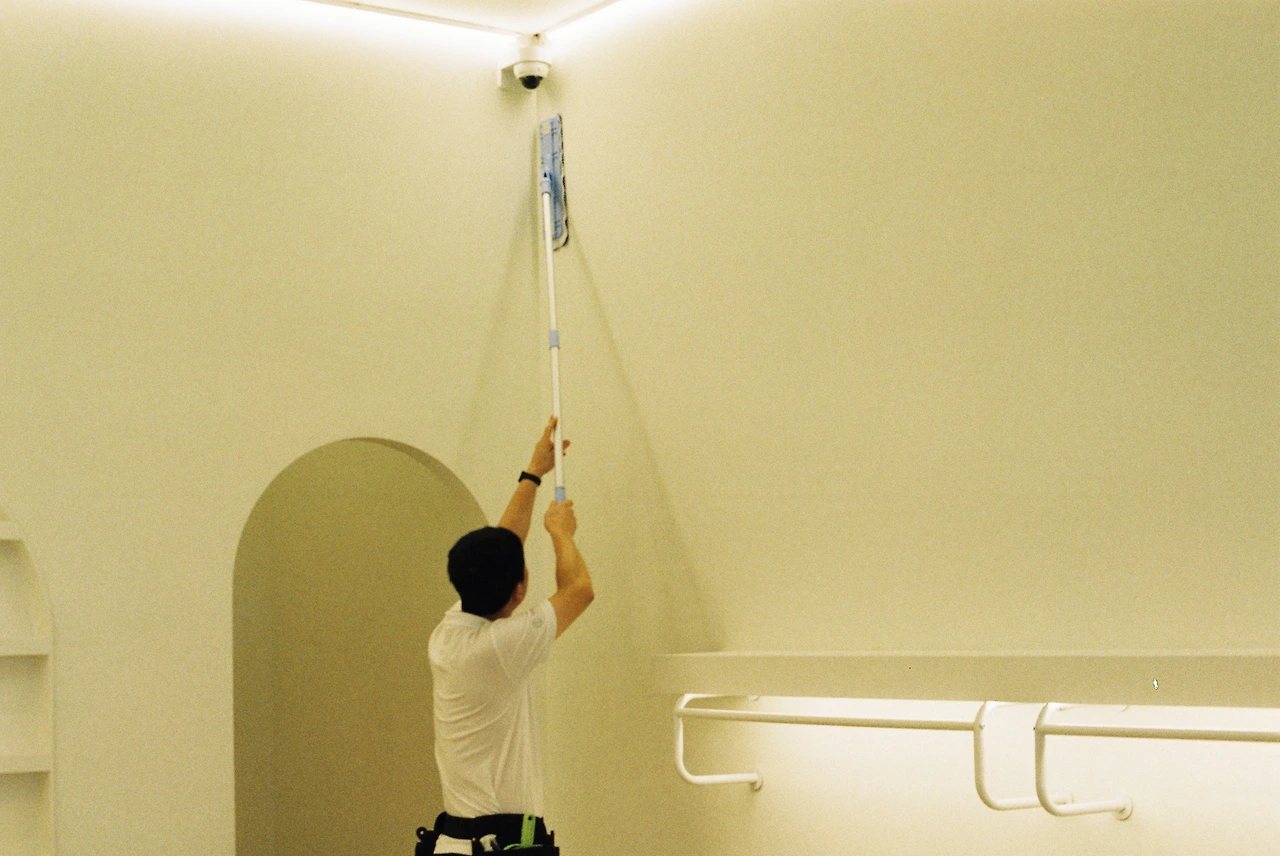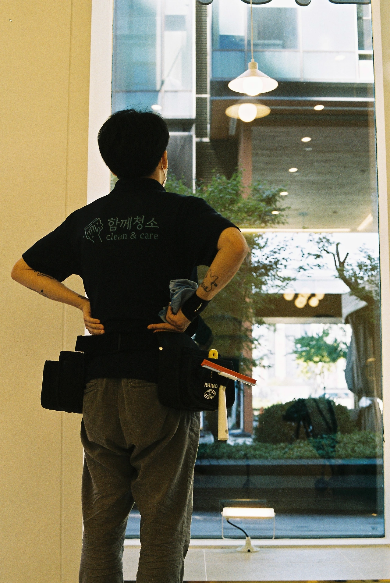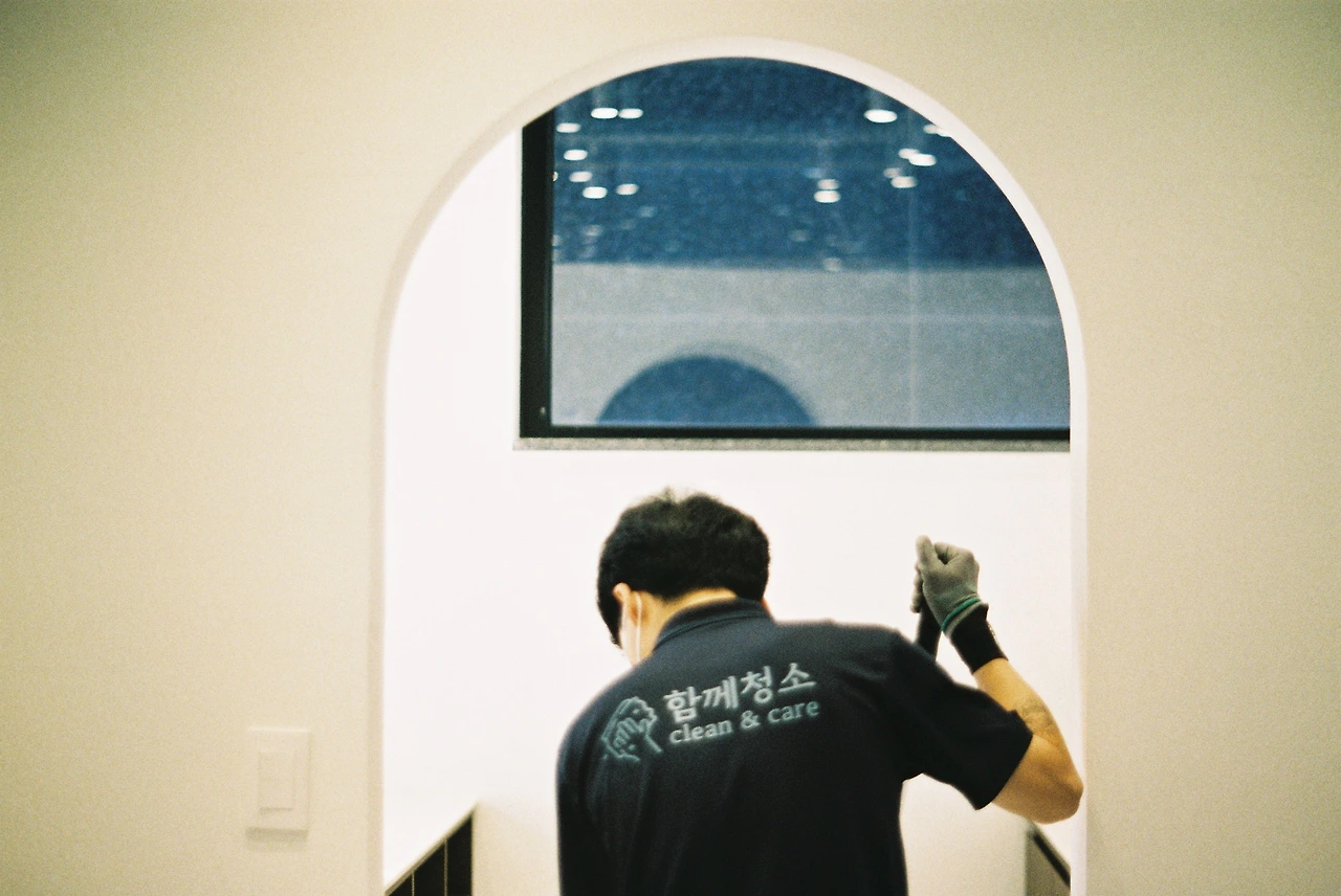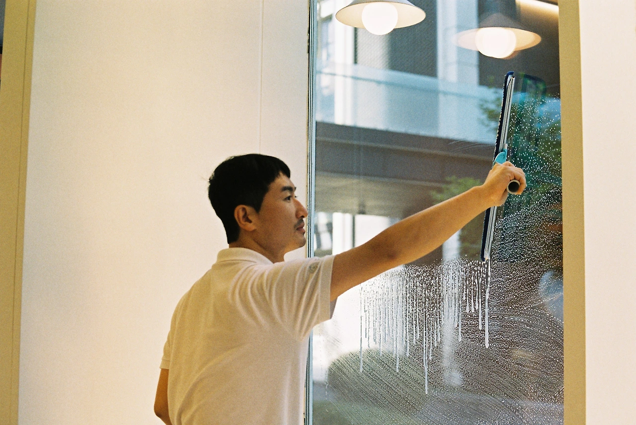 스퀴지로 유리 닦는 중
