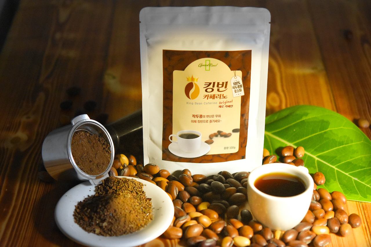 킹빈은 일단 커피는 아니고요. 커피와 유사한 풍미와 쌉싸름한 아메리카노 같은 맛이 있어요. 킹빈은 100% 국산 작두콩으로 가공하기 때문에 대부분 수입에 의존하고 있는 커피와는 원재료의 출처가 다르다고 볼 수 있겠고요. 요즘 디카페인 커피가 인기를 끌고 있는데 디카페인이라 해서 100% 카페인이 제거되는 것이 아니잖아요. 그에 반해 킹빈은 경우는 무카페인이에요.
