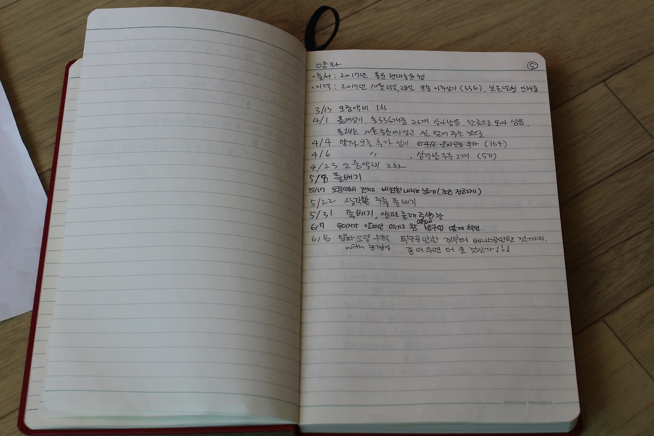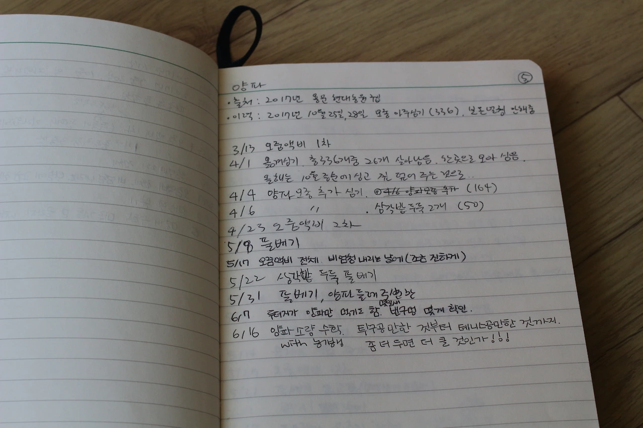 이번에는 작은 수첩 하나를 펼쳐서 유심히 들여다보시더니 내게 넘겨주신다. 수첩에는 작물을 심고 어떤 작업을 했는지가 날짜별로 빼곡히 기록되어 있다. 분명 이러한 기록들이 더욱더 멋진 농부로 성장시켜주리라는걸 믿어 의심치 않다.