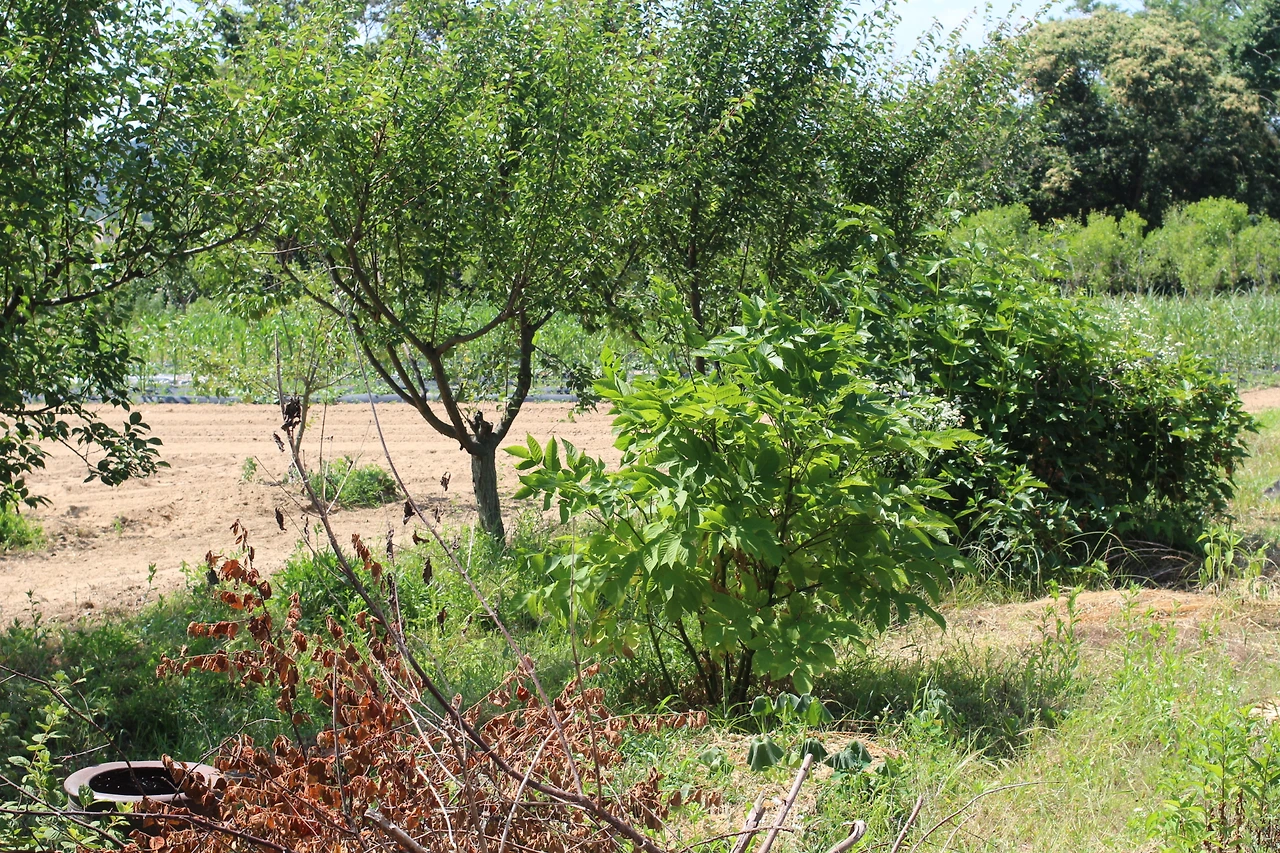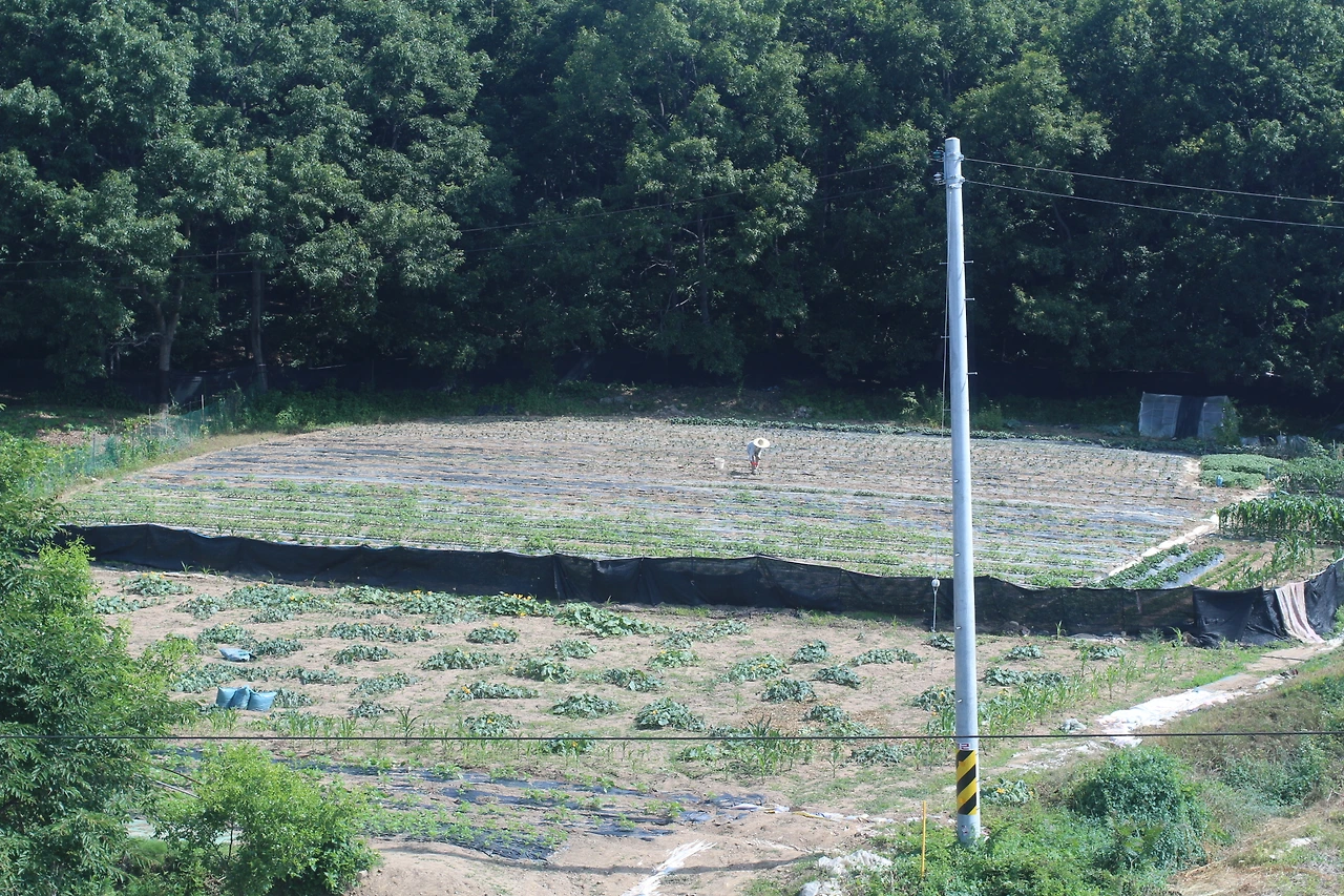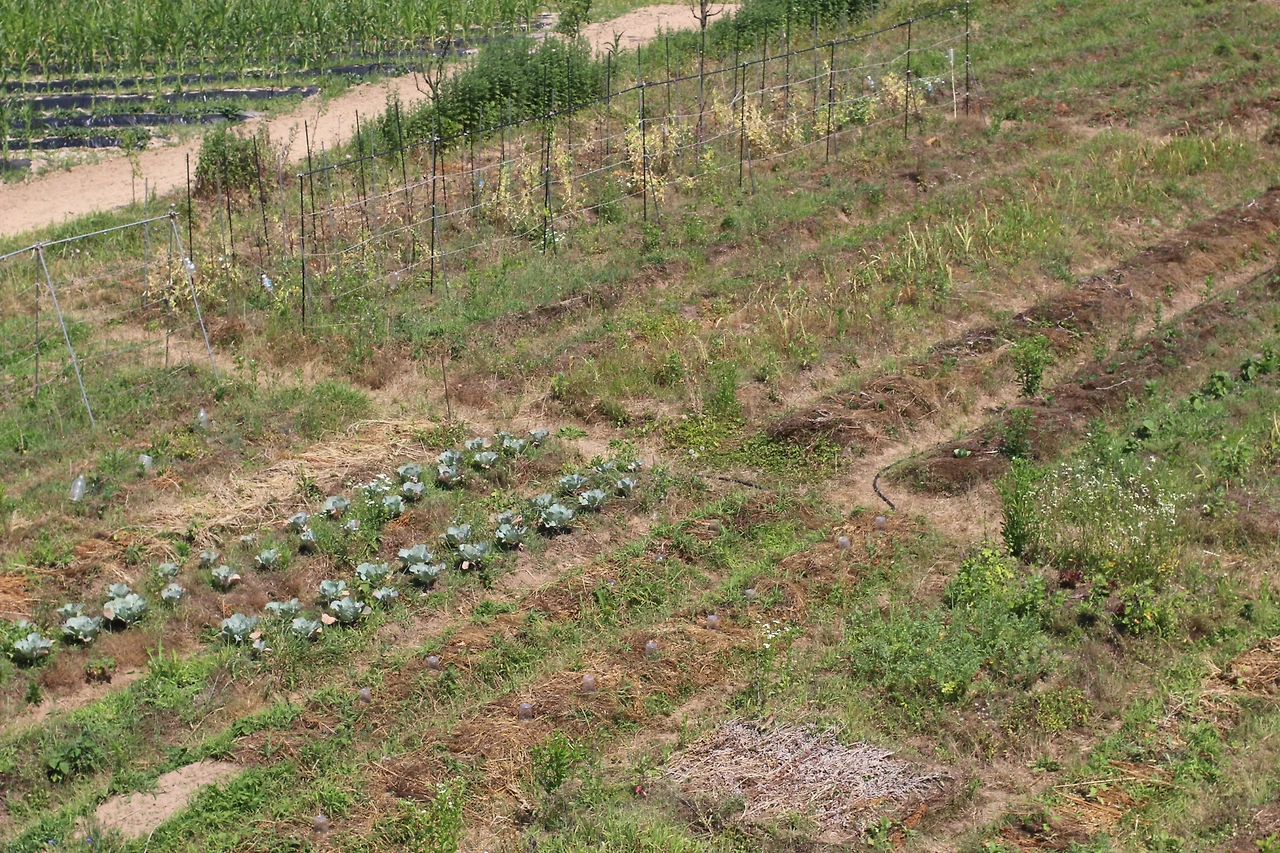 인터뷰에 앞서서 농장을 구경하기 위해 마당으로 나갔다. 마당에서 정면을 보니 밭이 보인다. 처음 밭을 보았을때는 조금 어리둥절했다. 밭이 맞는 것 같기는 한데 어떤 것이 작물이고 잡초인지 분간하기 헷갈렸다. 그래서인지 부부의 밭 너머 옆집 주인의 잘 정돈 된 옥수수밭이 더욱더 도드라져 보였다.