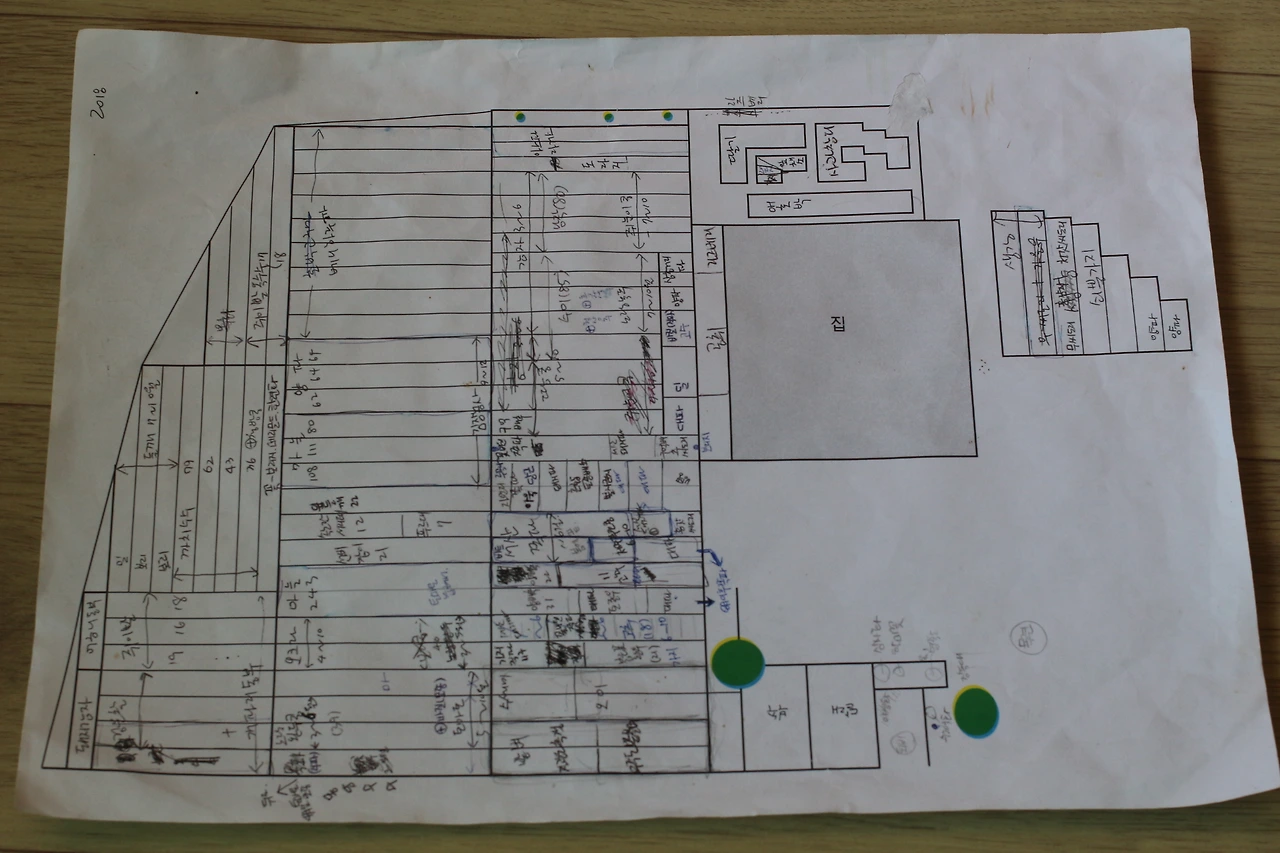 신범씨가 A4용지 하나를 꺼내 보여주신다. 도면 같기도 한데 자세히 들여다보니 농장 전체의 지도가 그려져 있다. 정말 밭에 이렇게나 많은 것들이 심겨 있을 줄이야. 이런 걸 두고서 농장 디자인이라고 부르는 걸까. 보지도 듣지도 못한 작물들의 이름이 꽤 많이 적혀 있다.