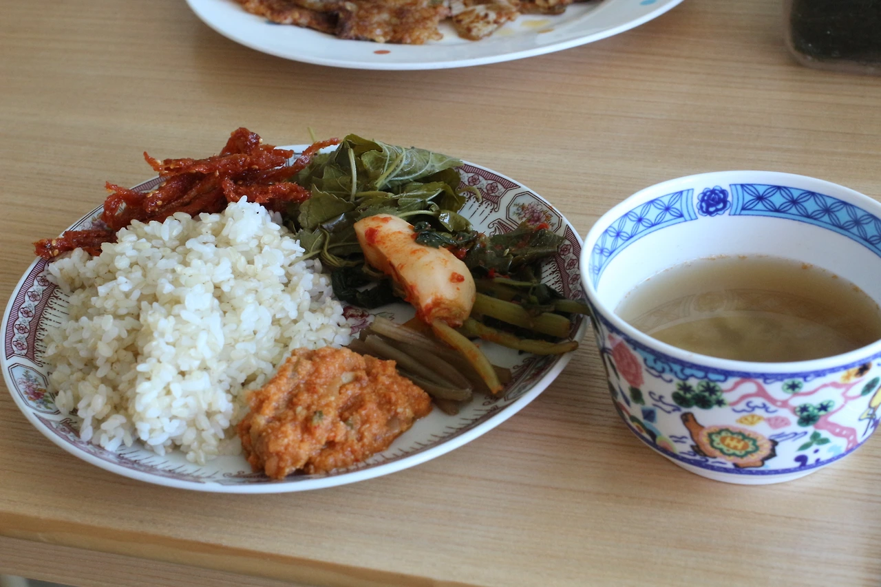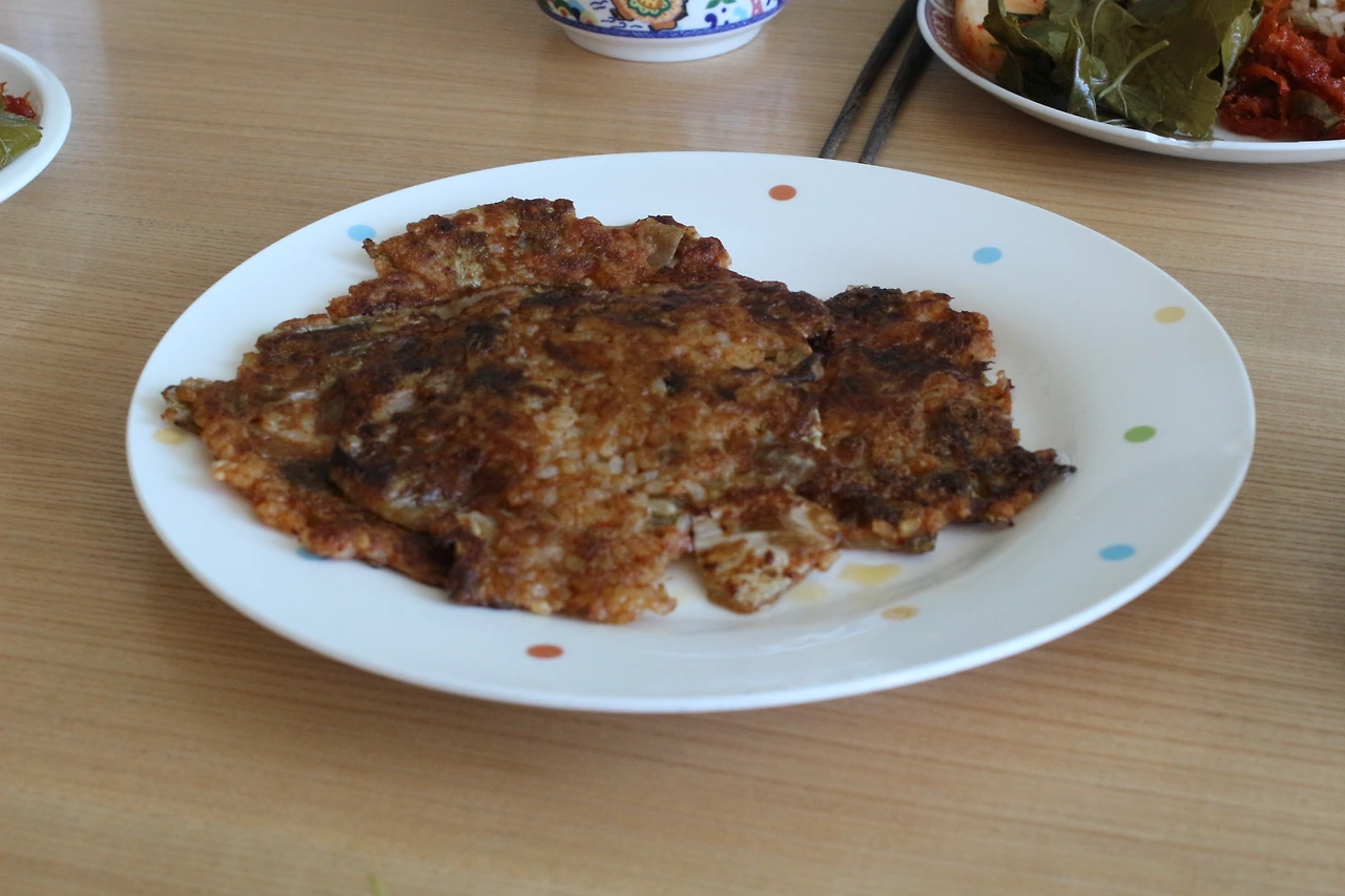 곧이어 김치전을 가져다주셨는데 특이하게도 김치전 안에 밥알이 같이 구워진 듯 보였다. 한 입 먹으니 짭조름한 맛이 입안 가득 전해져 온다. 반찬과 국 모두 맛있어서 배불리 먹다 보니 다시 처음 먹었던 양만큼 푸게 된다. 누군가와 함께 밥을 먹을 일이 잦은 요즘, '아, 역시 밥은 함께 먹을 때가 꿀맛이구나!'하는 생각이 스쳐 간다.