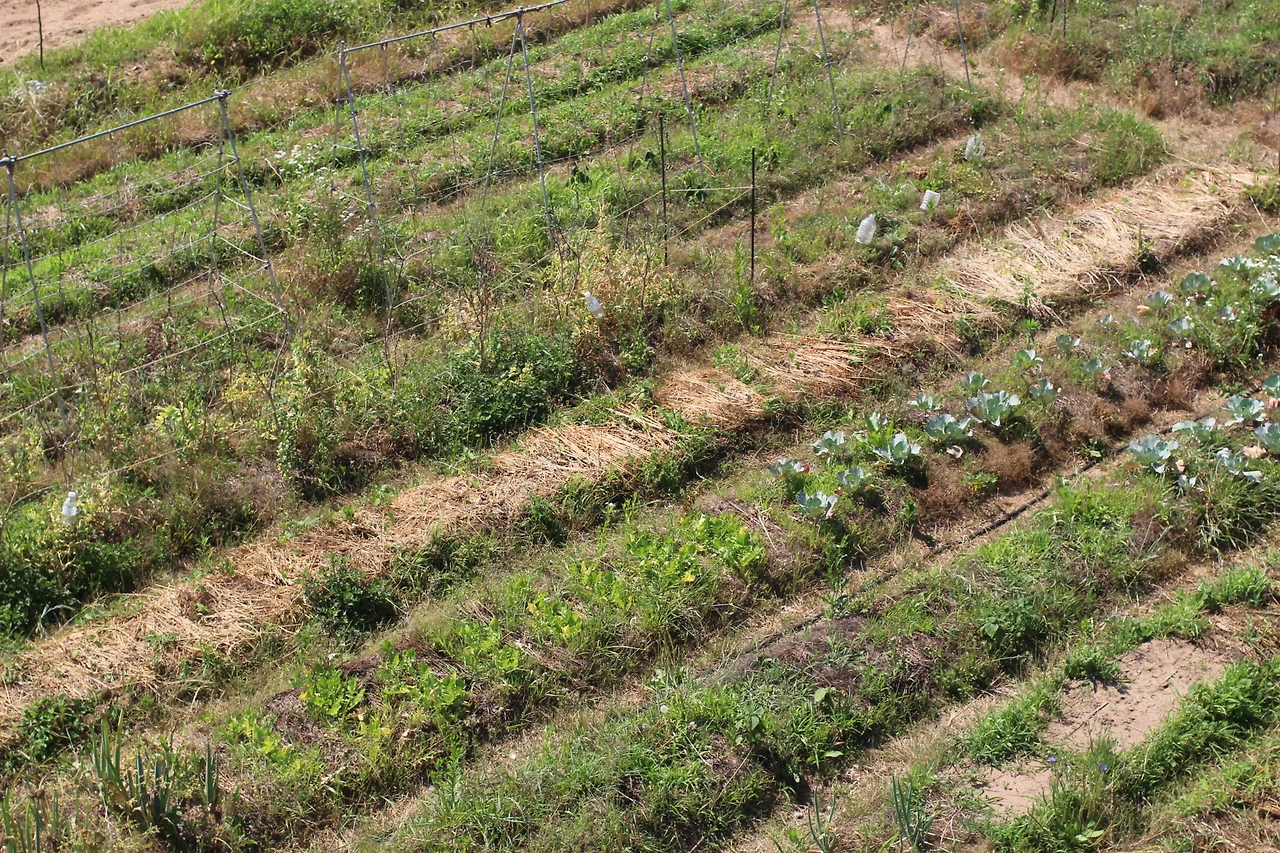 밭의 안쪽으로 가보니 조그마한 공간이 나왔다. 이곳에는 딸기, 호박, 가지가 심겨 있다. 노지에서 키우는 딸기라니... 한참을 신기하게 바라보았다. 자연농법으로 농사를 짓고 있다는 이야기가 조금씩 와 닿기 시작했다. 여느 농장에서 볼법한 비닐은 눈을 씻고 찾아볼 수 없다. 두둑에 군데군데 볏짚으로 덮어놓은 곳이 눈에 띈다. 이 또한 자연 농법의 한 방법일 것이다.