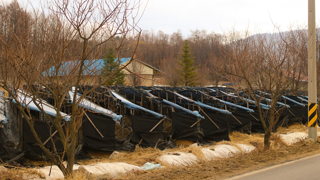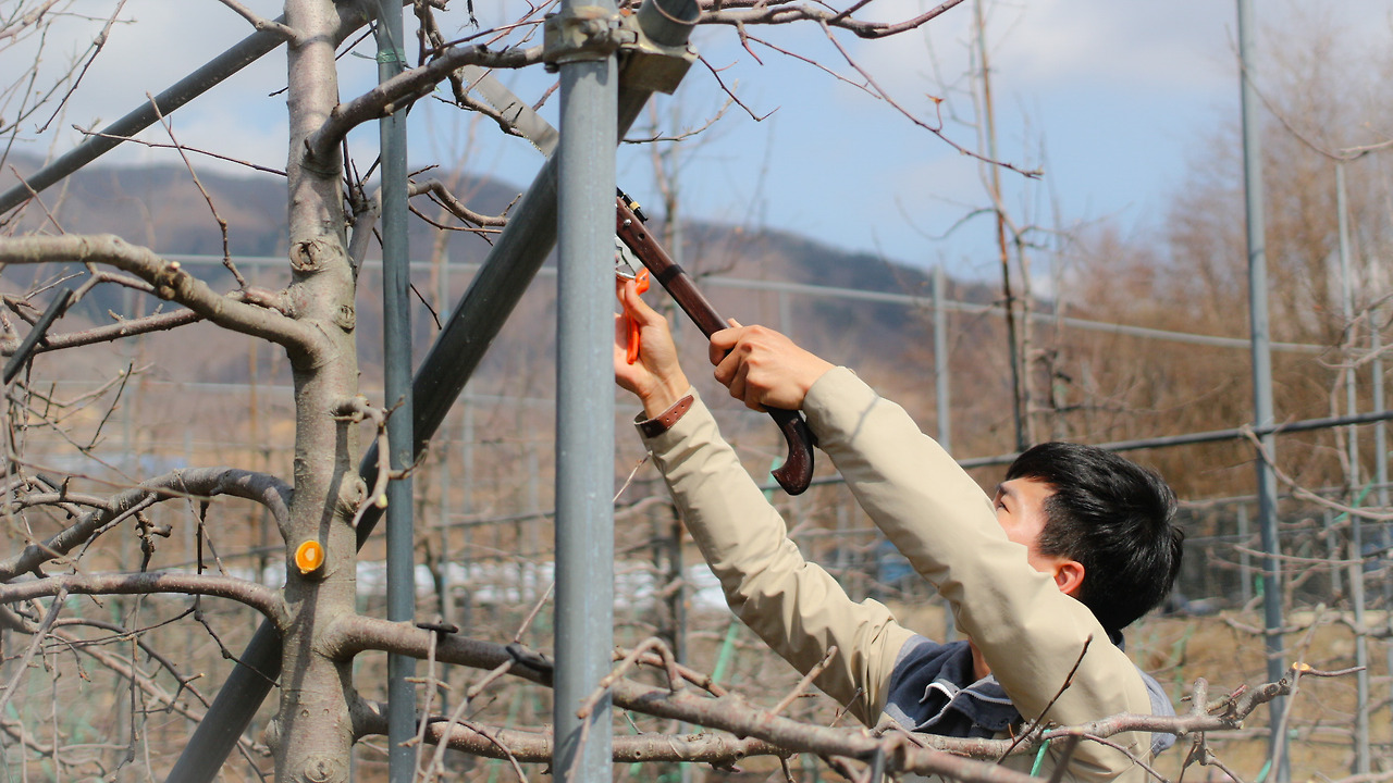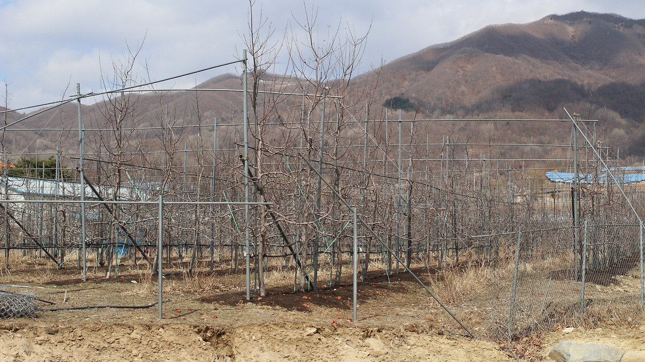 최동녘 농부와 트럭을 타고 시골길을 따라 도착한 사과농장. 다소 왜소한 모습의 사과나무들이 빽빽하게 서 있는 모습이 보인다. 지금 우리 눈에는 마른 가지만 보이지만, 아마 지금부터 부지런히 가을의 풍성함을 준비하고 있겠지. 지금은 사과나무의 가지치기를 하는 아주 중요한 시즌인데, 요며칠 품앗이를 하느라 이 지역 저 지역을 돌아다녔다고 한다. 그래서 정작 본인 농장 일은 뒷전이 된 상태라 서둘러 가지치기를 해야 된다고 한다.