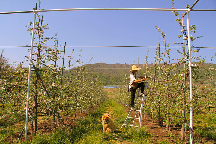 보통 4월에 사과나무에서 꽃이 피기 시작해요. 그러면 5개의 꽃봉오리가 맺히는데 한봉오리만 놔두고 다 제거해줘야 해요. 그 작업을 '적뢰'라고 부르죠. 그리고 꽃이 피면 붓으로 수분 가루를 묻히는데 '꽃을 수정' 시키는 작업이에요. 벌이 해야 되는 일을 왜 사람이 하냐고 물어보실 수도 있는데요. 벌은 꽃에 있는 꿀만 대강 빨아먹거든요. 그래서 5개의 씨를 모두 수정시키지는 못해요.