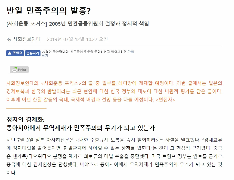 일본의 무역보복 이후, 국내에서 일본 제품 불매운동이 일거나(시민적 차원) 외교적으로 강경 대응할 때 마다(정부적 차원) 이를 비판하는 논리가 있었으니, 바로 ‘민족주의’였다. NO JAPAN(뒤엔 NO ABE로 바뀌긴 했으나) 시류에 동참하는 이들을 ‘반일 민족주의’라며 비판하는 이들이 있었다. 개인적으로 이 책을 읽기 전엔 세계화니 글로벌리즘이니 등을 생각하면서 ‘진짜 민족주의라서 문제일까? 우리가 세계 시민으로서 일본과 친하게 지내야 하는 걸 우선 생각해야 하는 게 아닐까?’하고 걱정 아닌 걱정을 하기도 했다.