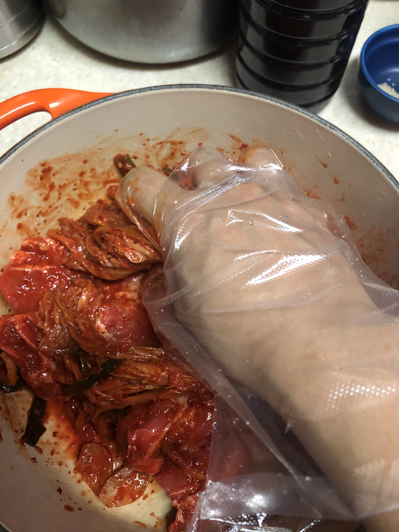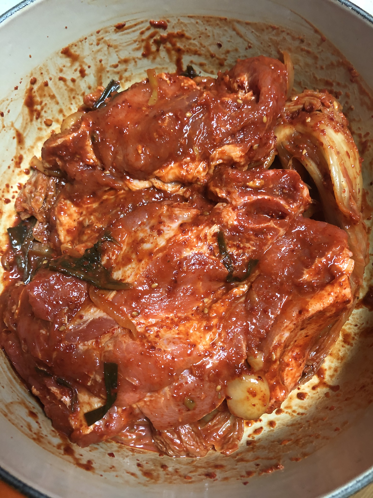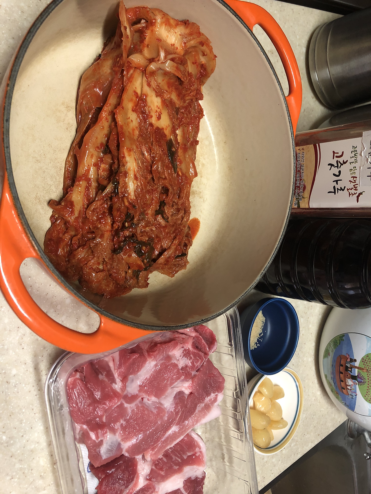 재료: 김치 1/4포기, 두툼한 돼지고기 500g(목살, 삼겹살, 앞다리살), 국간장 1/2술,~1술, 고춧가루 1/2술~1술, 설탕 조금, 마늘