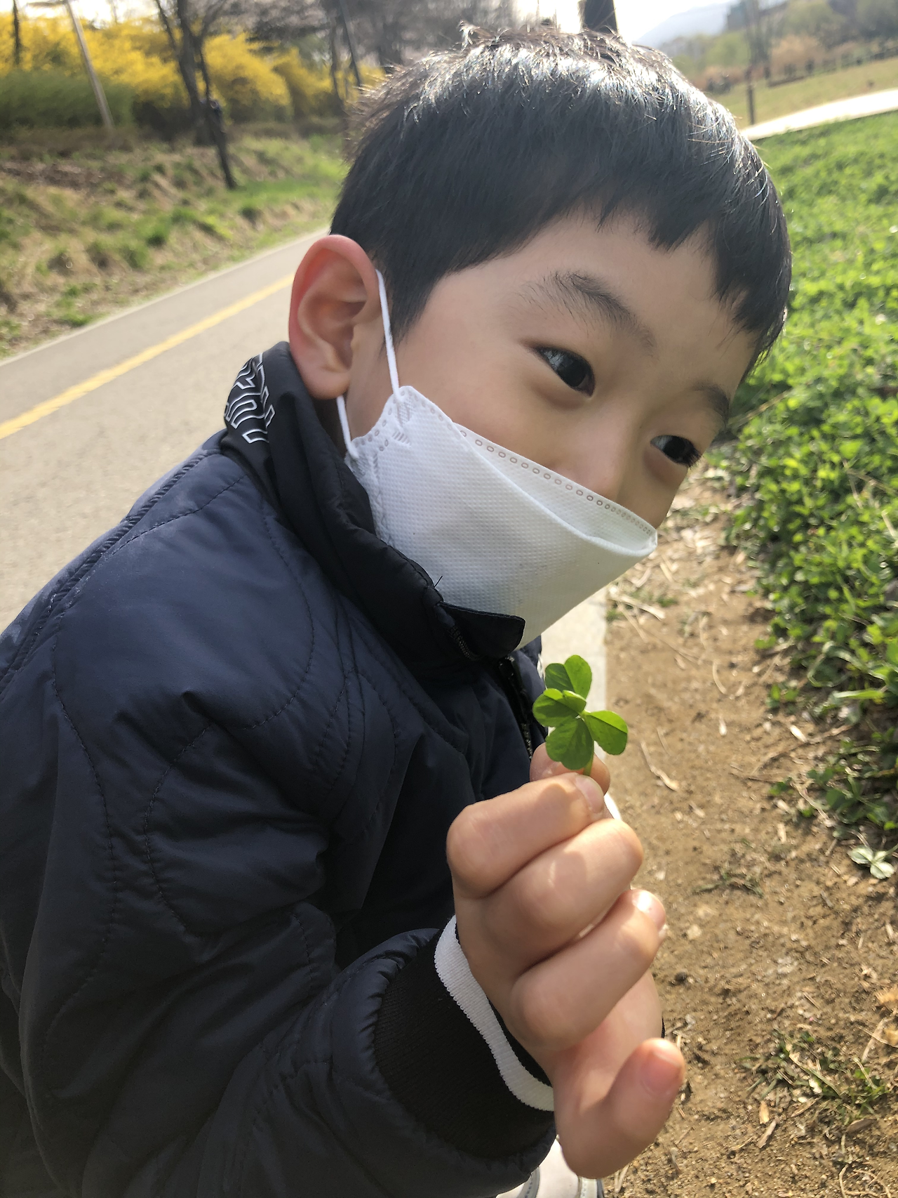 네 잎 클로버는 행운이라고 하죠? 나폴레옹이 “오, 네 잎이네”하고 허리를 숙이는 순간 총알이 비켜가고 목숨을 건진 데서 네 잎 클로버가 행운의 상징이 되었다는 설이 있다고 합니다. 생물학적으로는 유전적 변이, 즉 돌연변입니다. 정확한 발생 비율은 알 수 없지만, 일정하게 낮은 비율로 나타난다고 합니다. 다시 말하자면, 클로버가 무더기로 있는 곳엔 네 잎 클로버가 있기 마련이라는 뜻입니다. 그리고 시각적으로 예민한 우리 모자는 네 잎 클로버쯤은 마음만 먹으면 쉽게 찾습니다. 어떻게 찾느냐고 물으신다면, 그냥 들여다보면 다르게 생긴 하나가 눈에 띈다는 정도입니다.